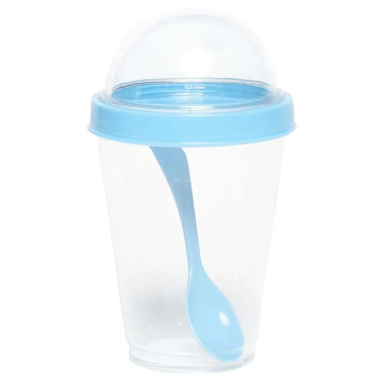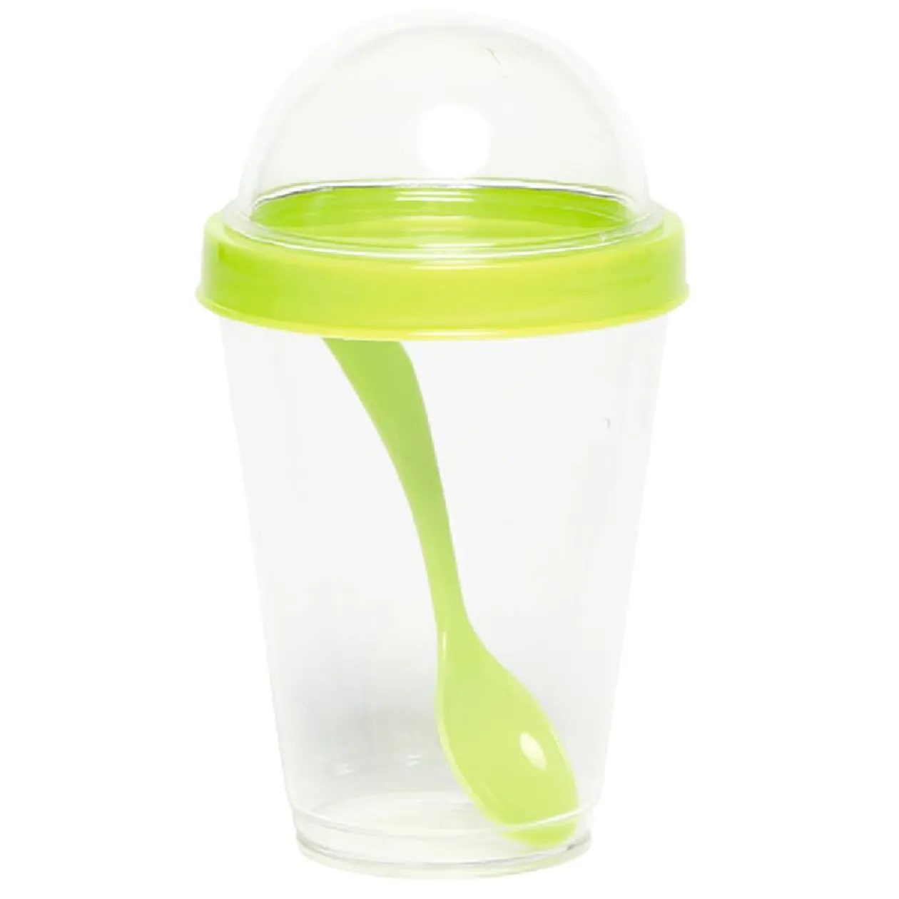 Gobelet à yaourt avec sa cuillère assortie.Existe en 3 coloris selon disponibilité en sotck : rouge, vert, bleu.