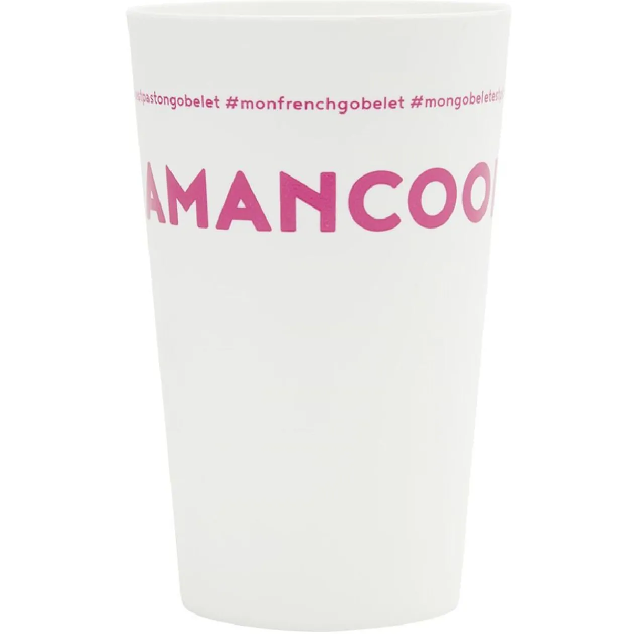 Gobelet réutilisable en plastique blanc avec inscription rose #MAMANCOOL.