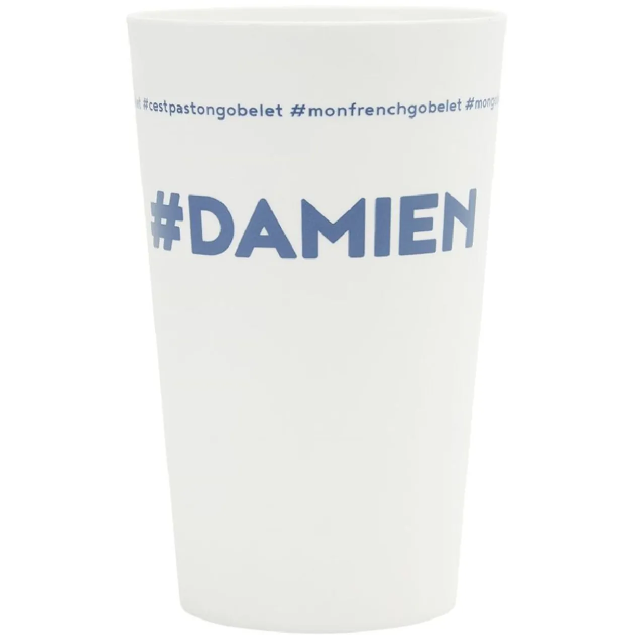 Gobelet réutilisable en plastique blanc avec inscription bleue #DAMIEN.