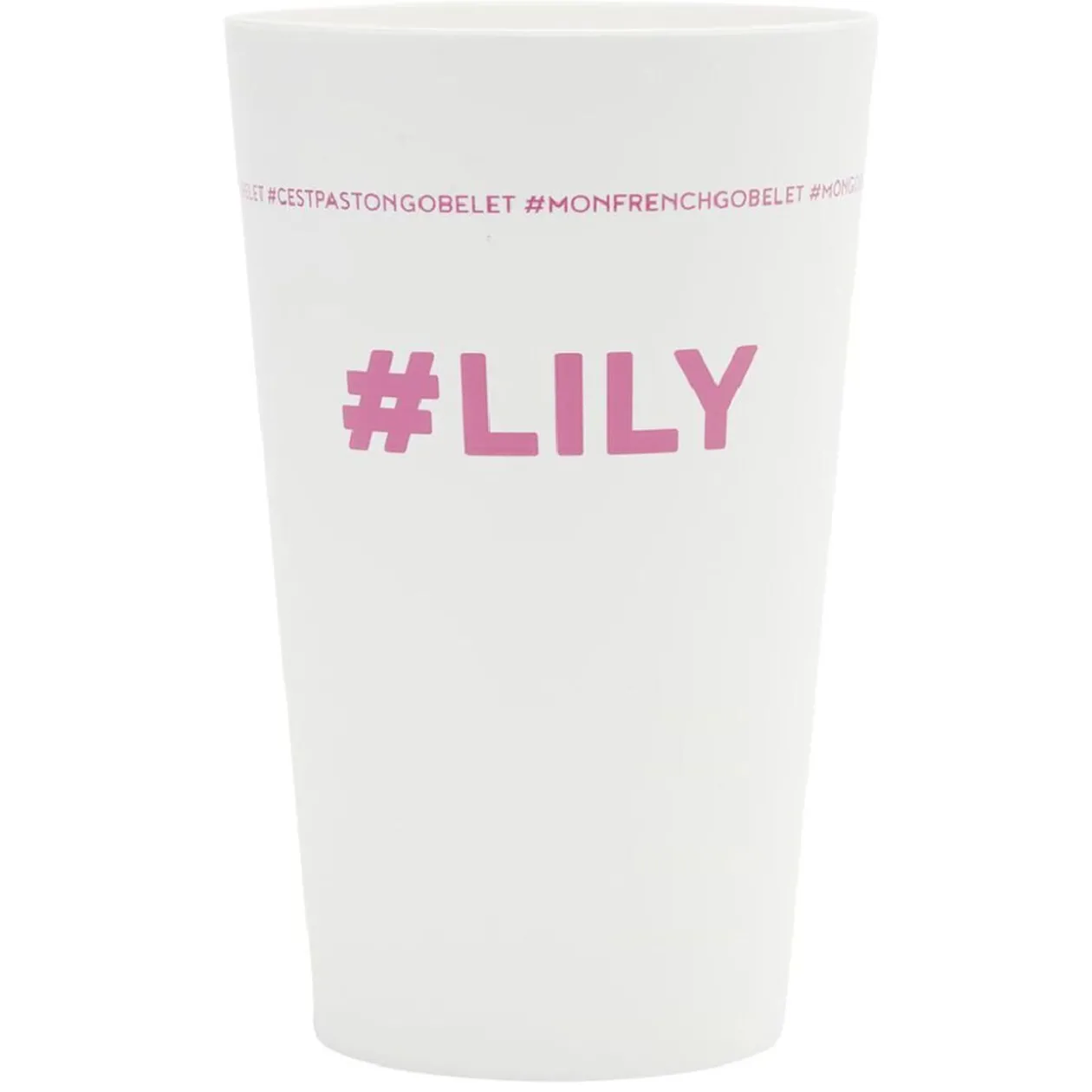 Gobelet réutilisable en plastique blanc avec inscription rose #LILY.