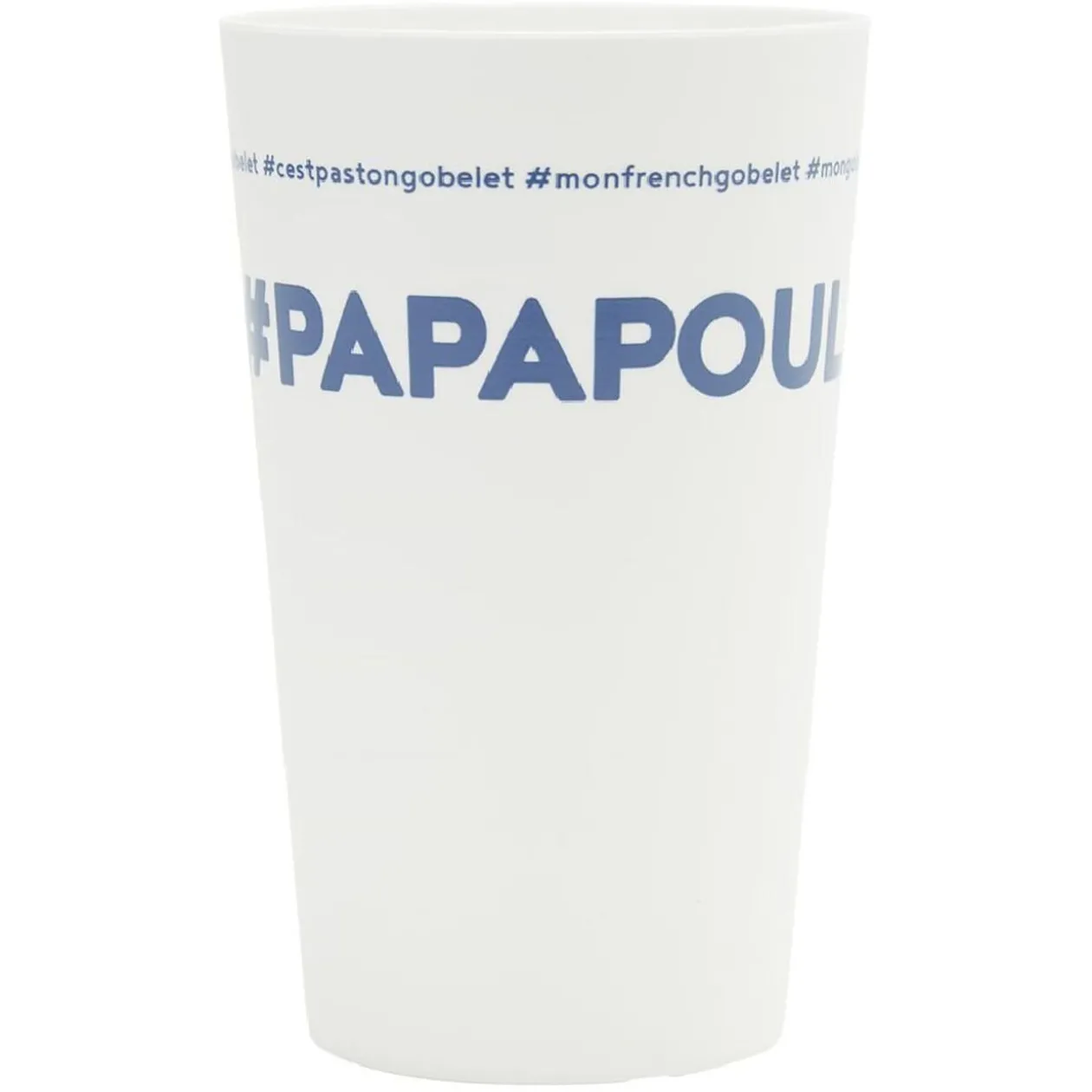 Gobelet réutilisable en plastique blanc avec inscription bleue #PAPAPOULE.