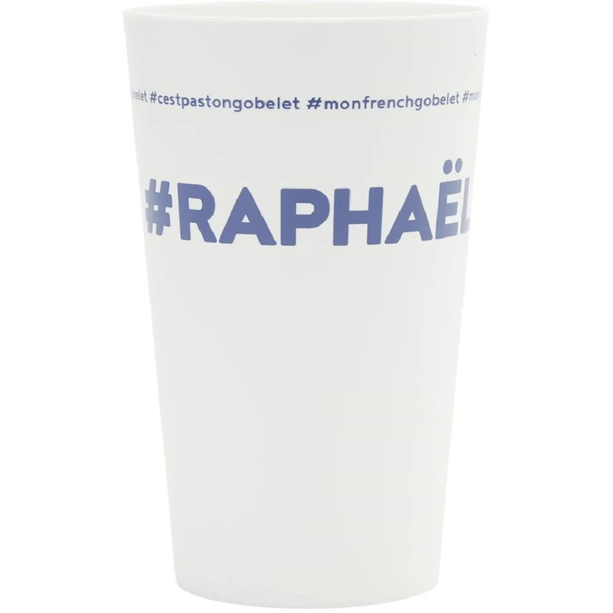 Gobelet réutilisable en plastique blanc avec inscription bleue #RAFAEL.