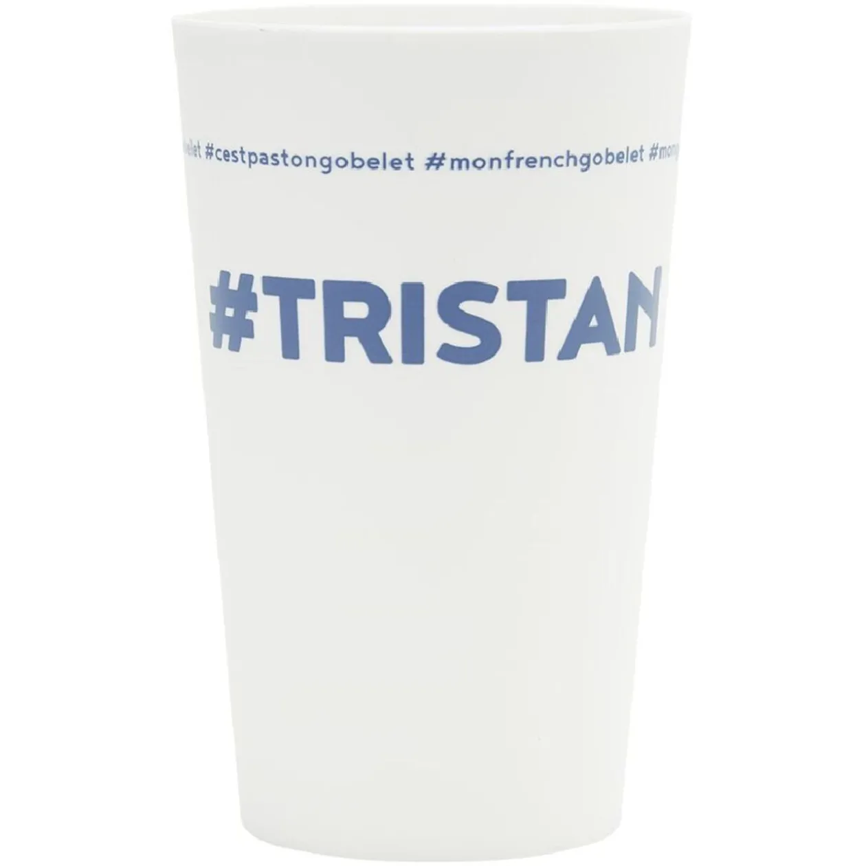 Gobelet réutilisable en plastique blanc avec inscription bleue #TRISTAN.