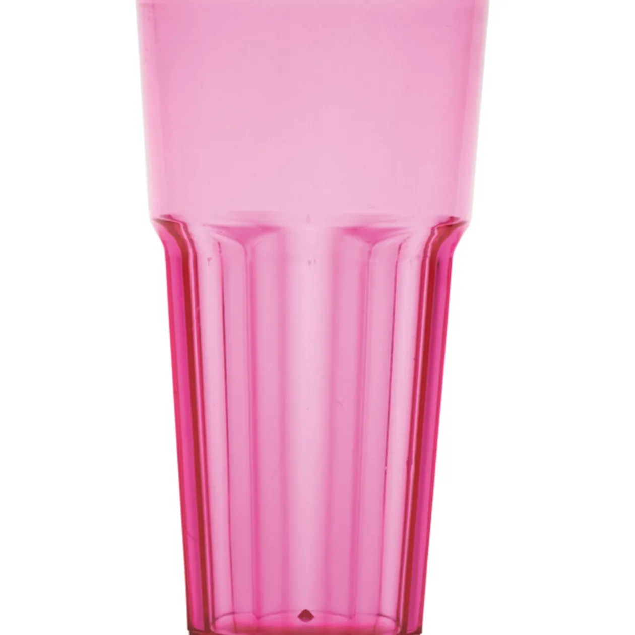 Gobelet rose transparent, cont. 60 cl, dim. 16,5×9 cm, plastique rigide.