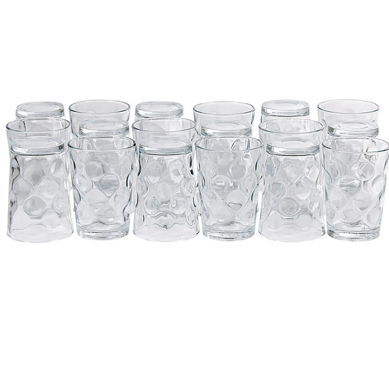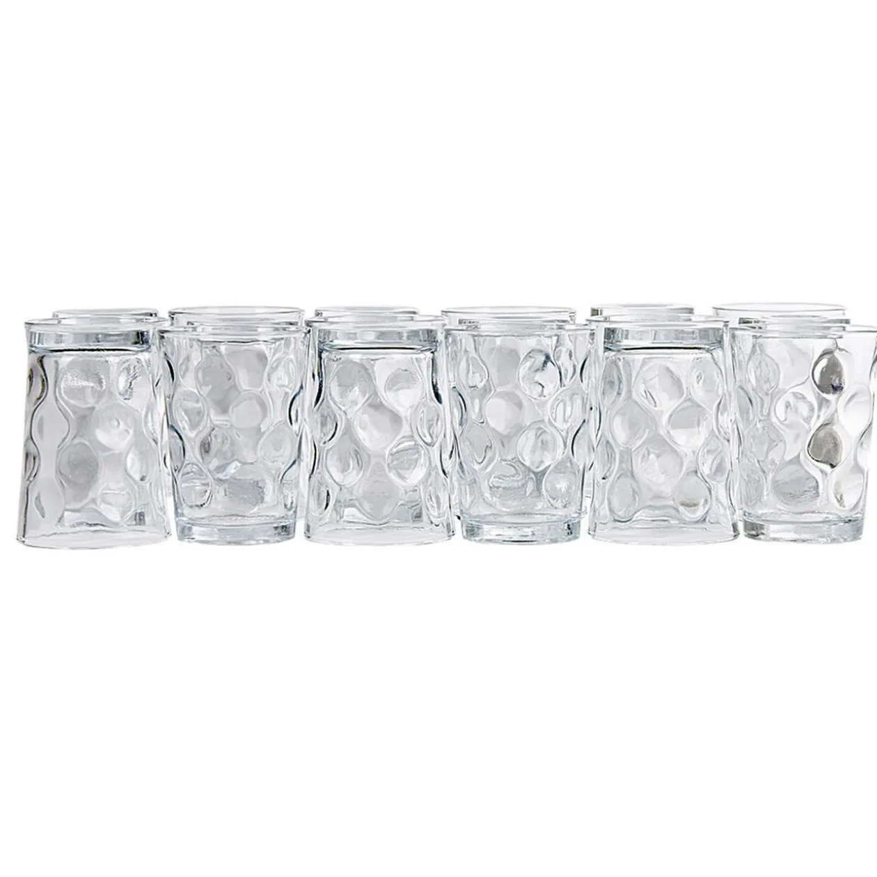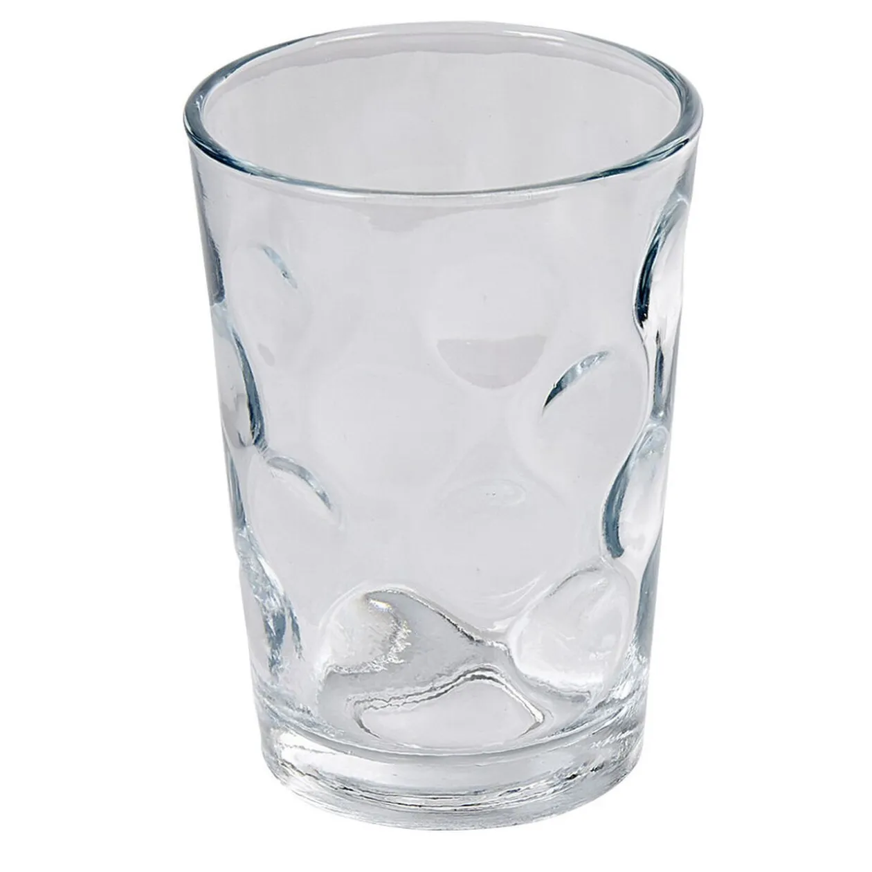 Lot de 18 gobelets en verre transparent avec ronds martelés, d’une contenance de 20 cl.
