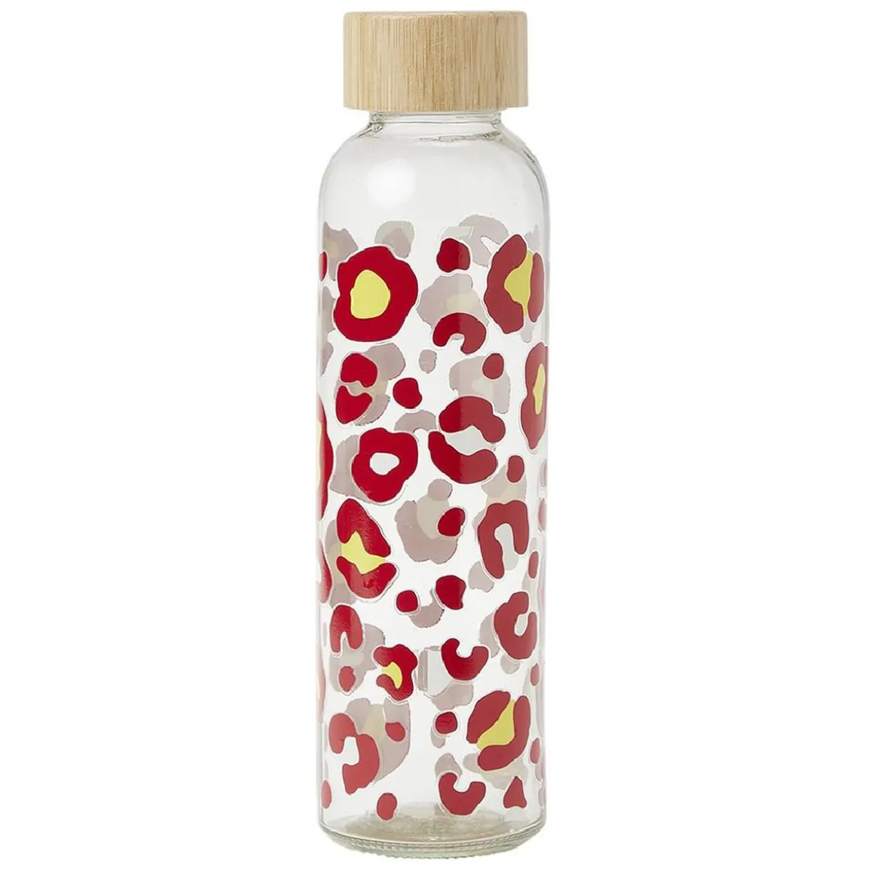 Remplissez de votre boisson préférée cette bouteille en verre à motifs avec bouchon en bambou.
