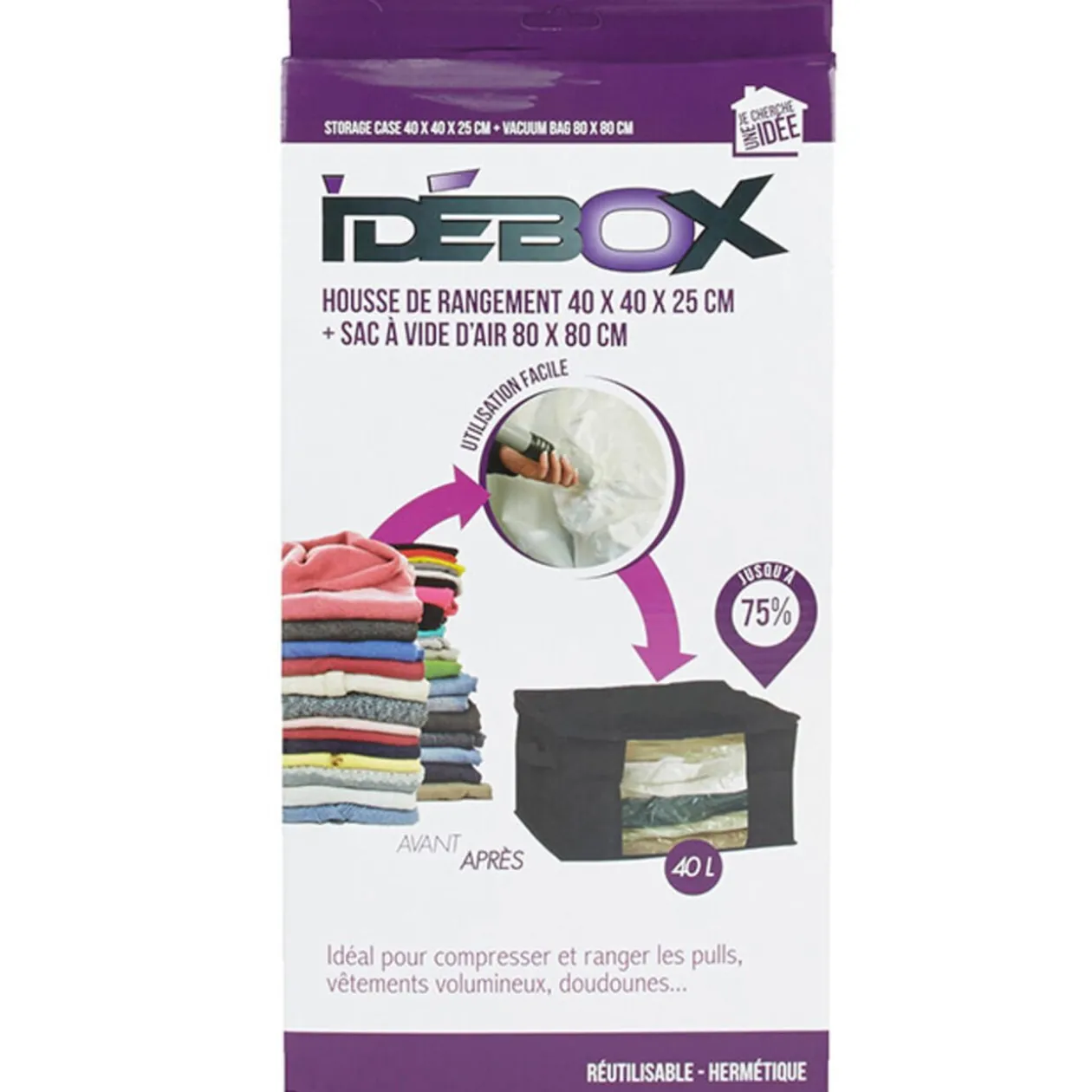 Housse de rangement 40 L, dim. 40x40x25 cm, 100 % polyester non tissé. Sac à vide air dim. 80×80 cm, 100 % polyéthylène. Réutilisable, hermétique et facile d’utilisation. Idéal pour compresser et ranger vos vêtements !