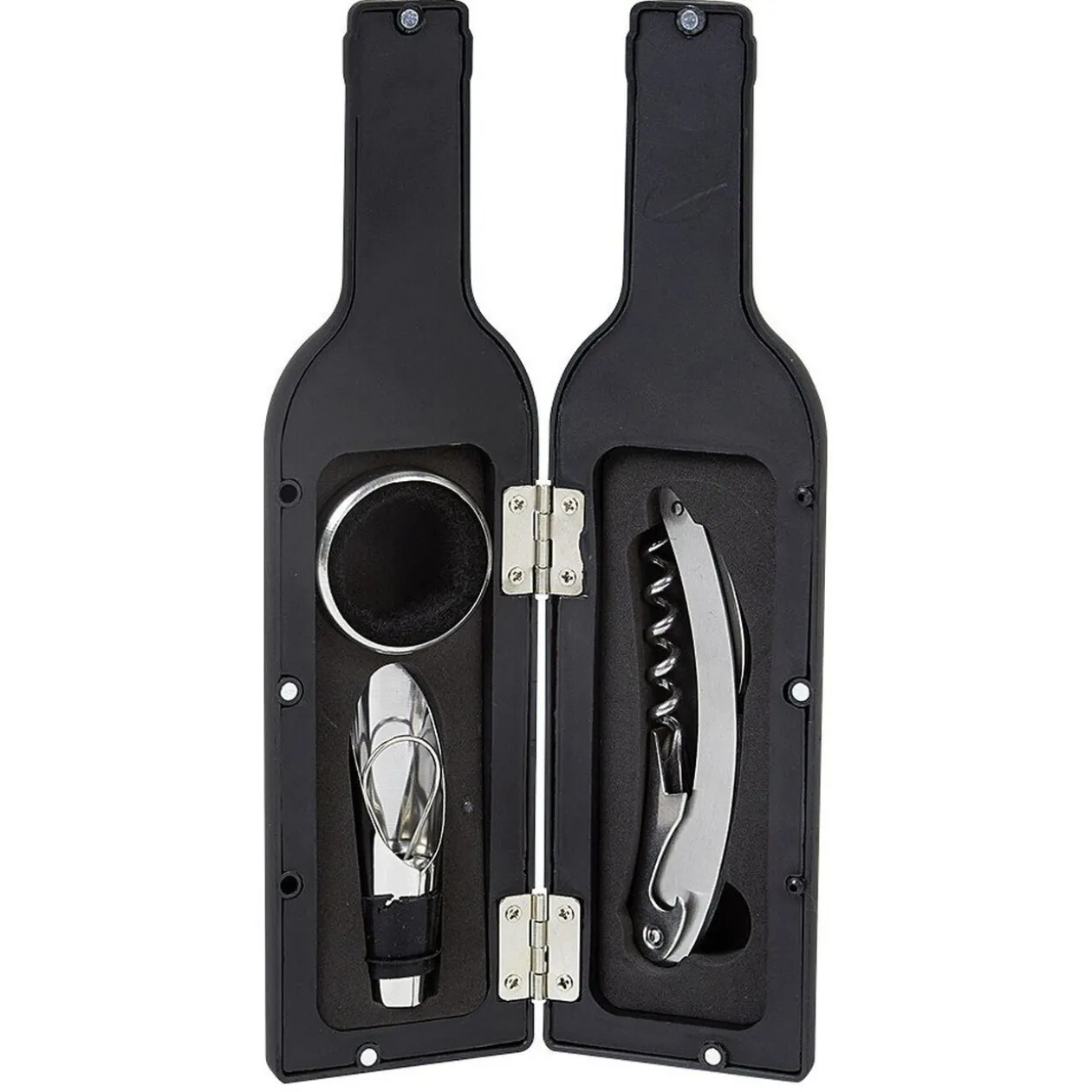 Coffret en forme de bouteille de vin comprenant 3 accessoires d’oenologie: un tire-bouchon, un bouchon de dosage et une bague anti-goutte.