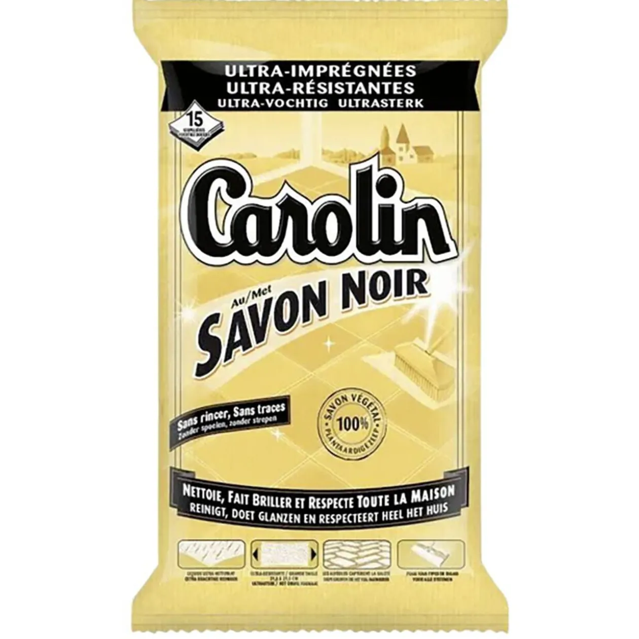 Paquet de 15 lingettes Carolin au savon noir 100% végétal pour nettoyer et faire briller toute votre maison tout en la respectant.