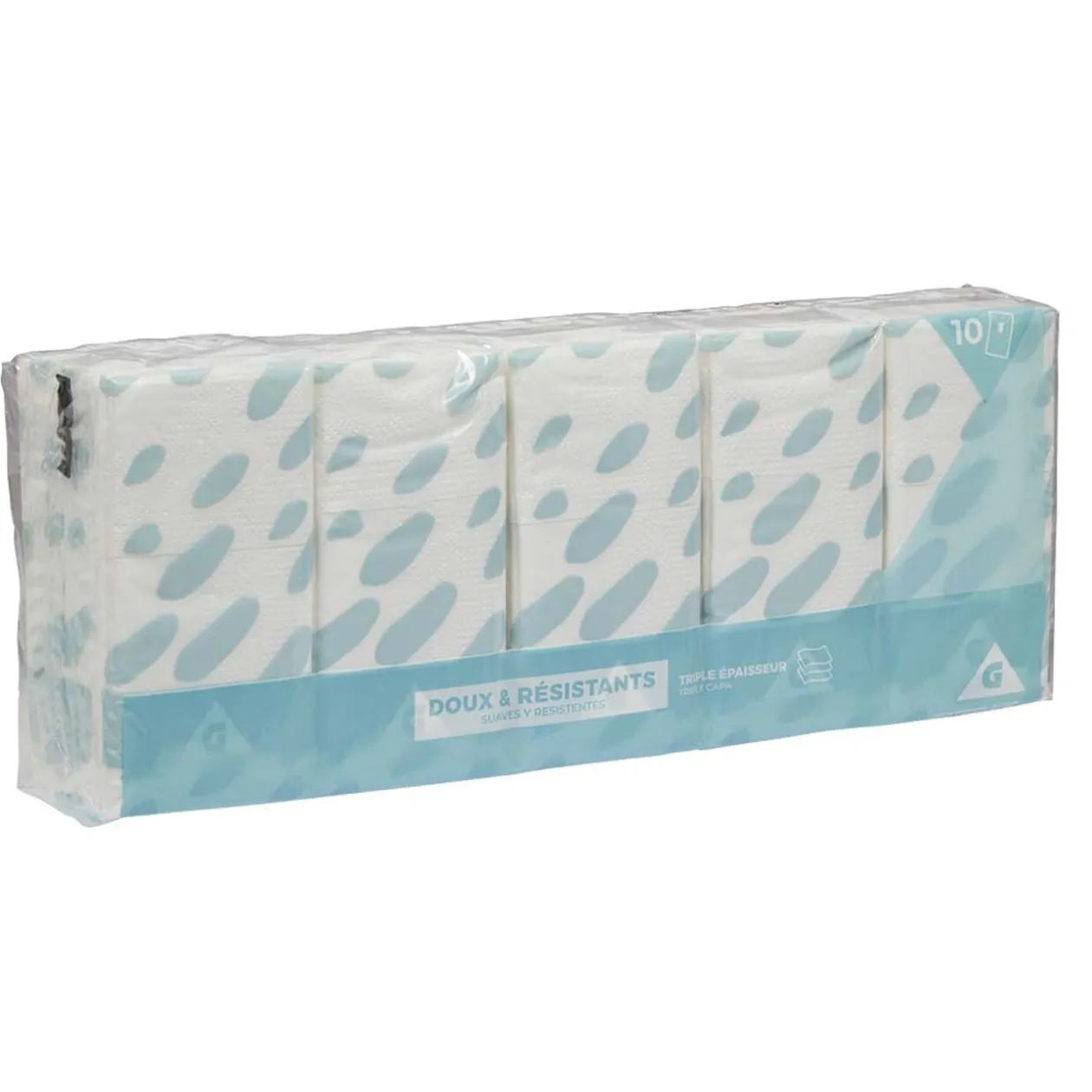 Lot de 10 paquets de mouchoirs en papier blanc. Gardez toujours en un à glisser dans la poche ou le sac pour ne jamais être à court.