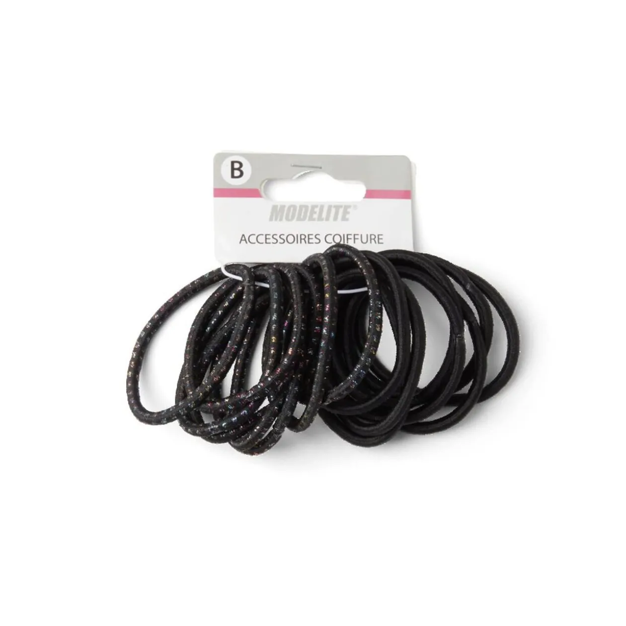 Ensemble de 15 élastiques à cheveux en polyester, comprenant 5 élastiques noirs classiques et 10 noirs ornés d’un fil métallique multicolore pour une touche de fantaisie.