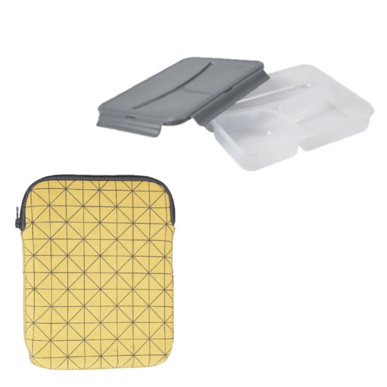 Idéale pour un déjeuner complet à l’extérieur ou au travail, transportez entrée, plat et dessert, le tout dans cette lunch box super pratique, sans les mélanger grâce à ses 3 compartiments étanches. Facile à transporter, sa housse de transport jaune aux formes géométriques est faite en néoprène afin de conserver une bonne isolation.