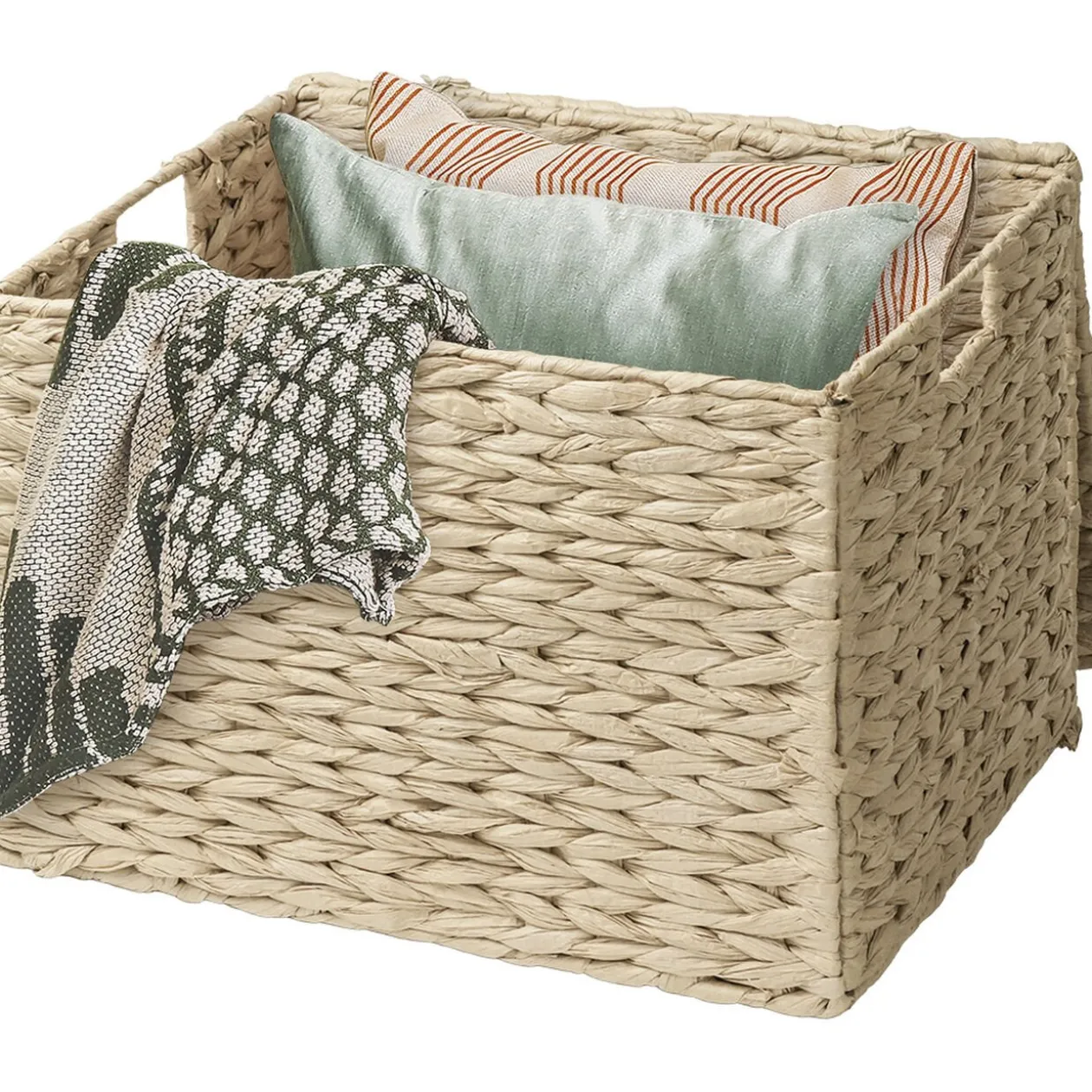 Grande malle en jonc de mer avec sangles et anses assorties.