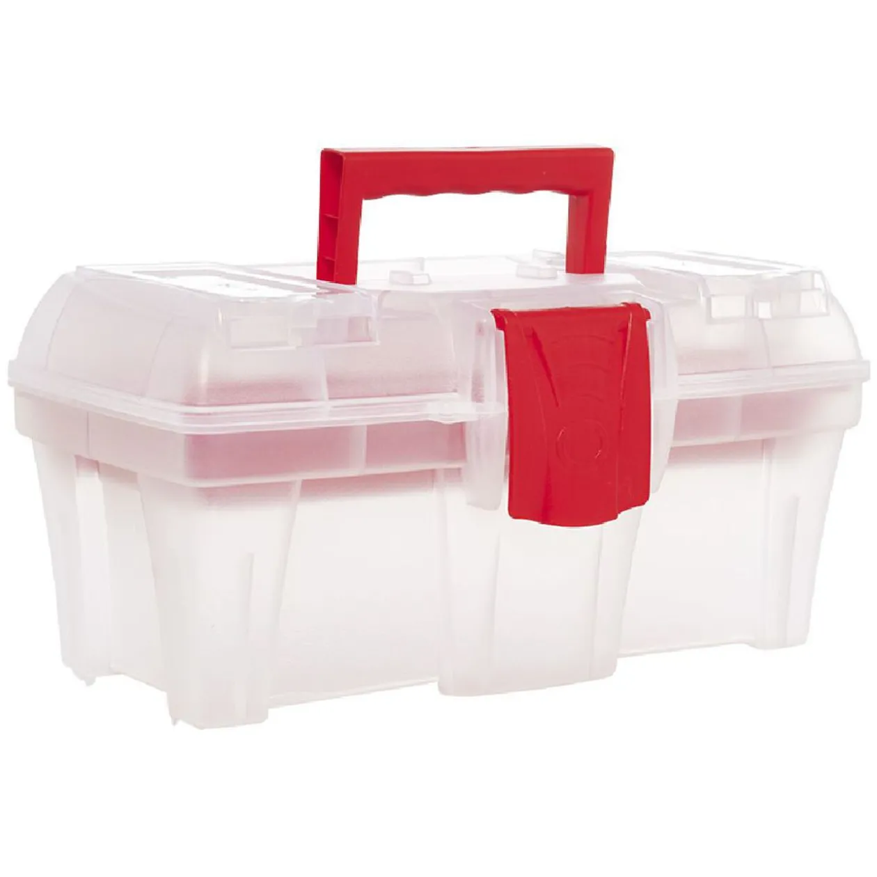 Mallette transparente à clips rouge ou bleu pour divers rangements.