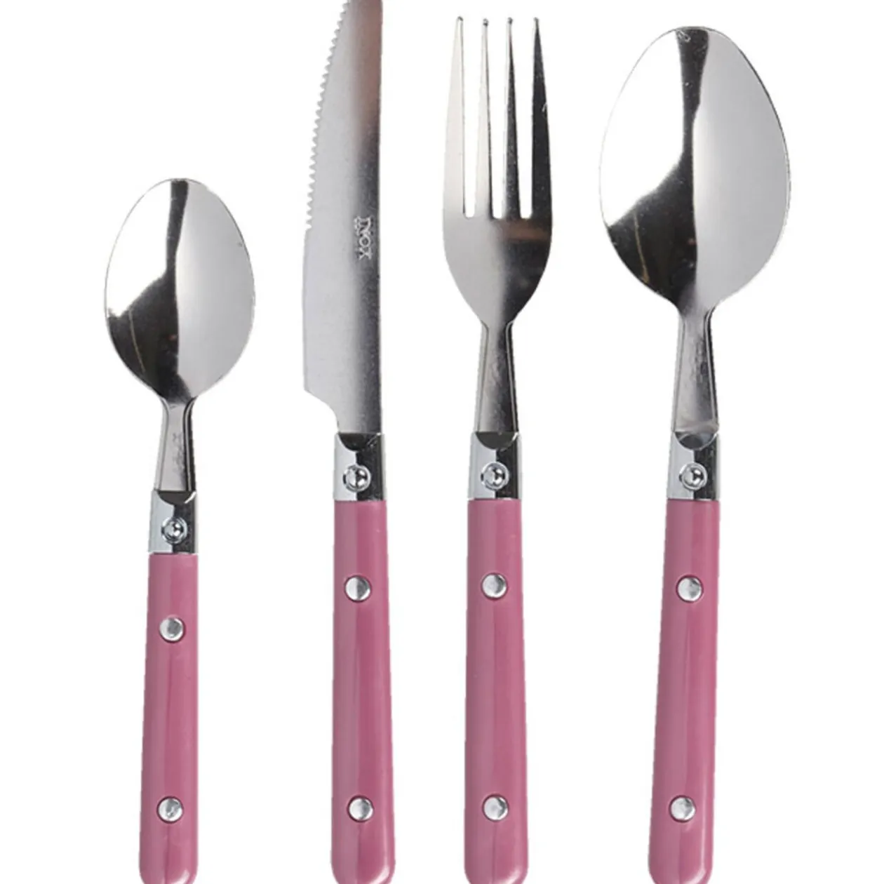 Ménagère 16 pièces rose comprenant 4 fourchettes, 4 cuillères à soupe, 4 couteaux et 4 cuillères à café, inox, manche plastique.