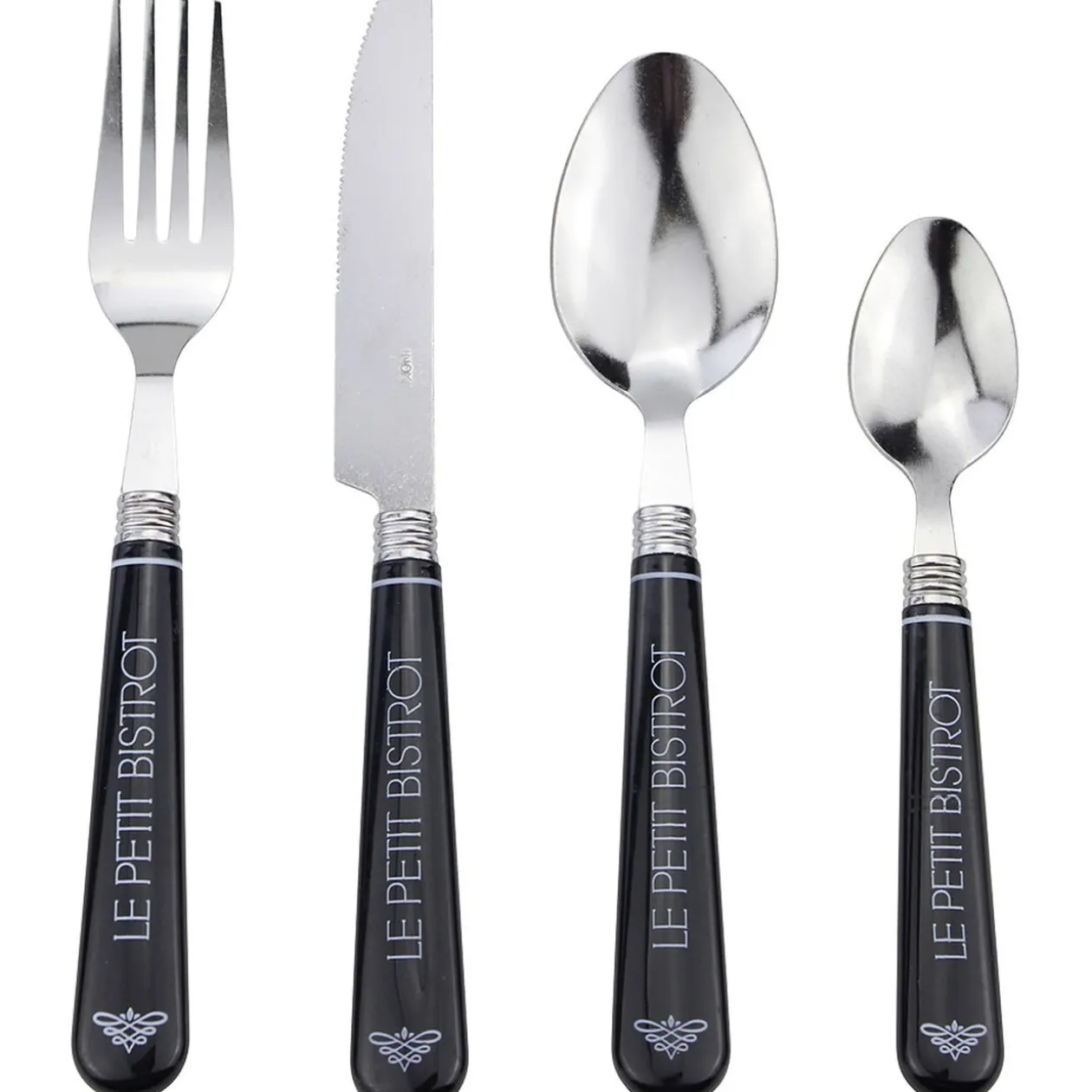 Ménagère de 24 pièces au coloris noir et aux inscriptions blanches « le petit bistrot ».
