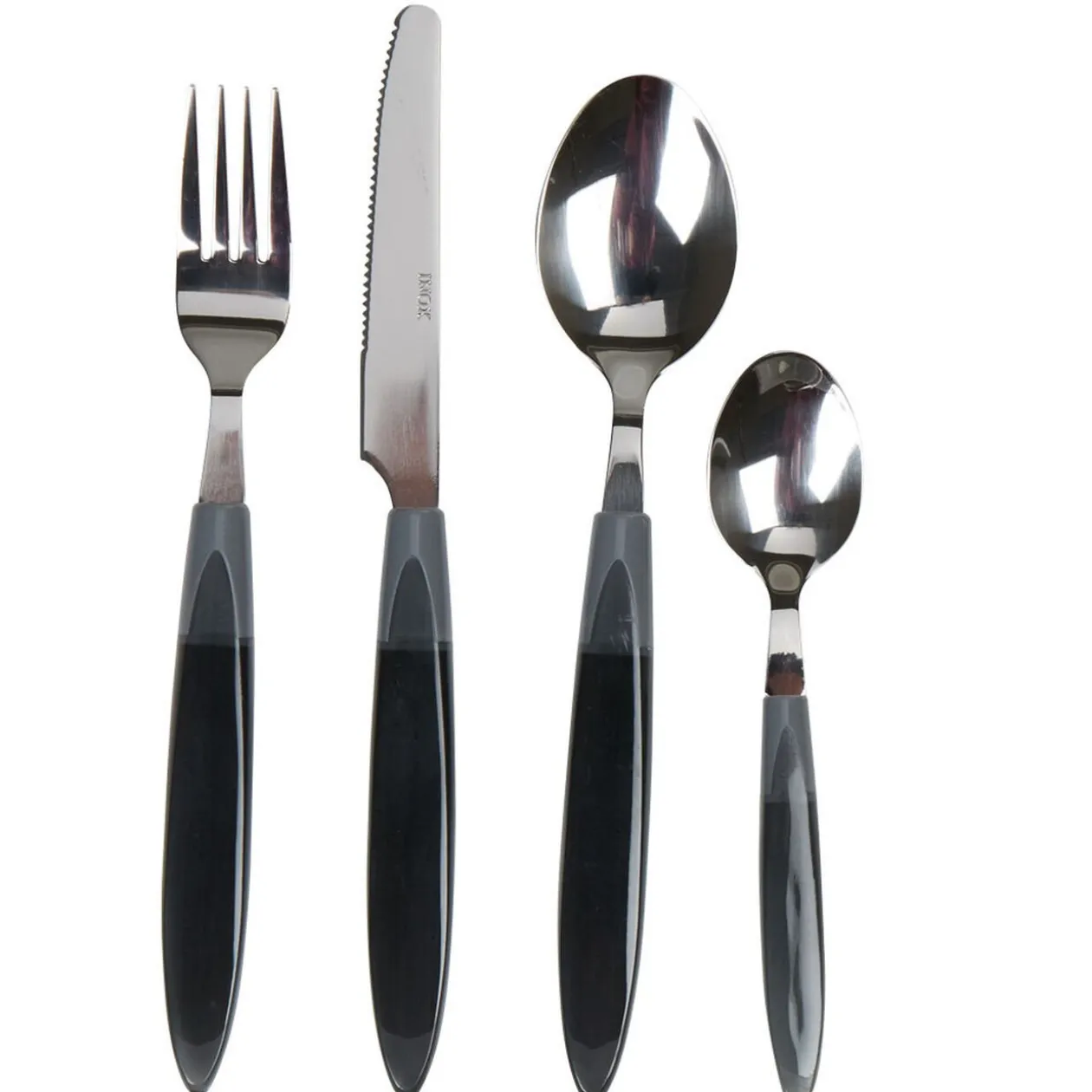 Ménagère 24 pièces avec manche transparent gris, inox et plastique.