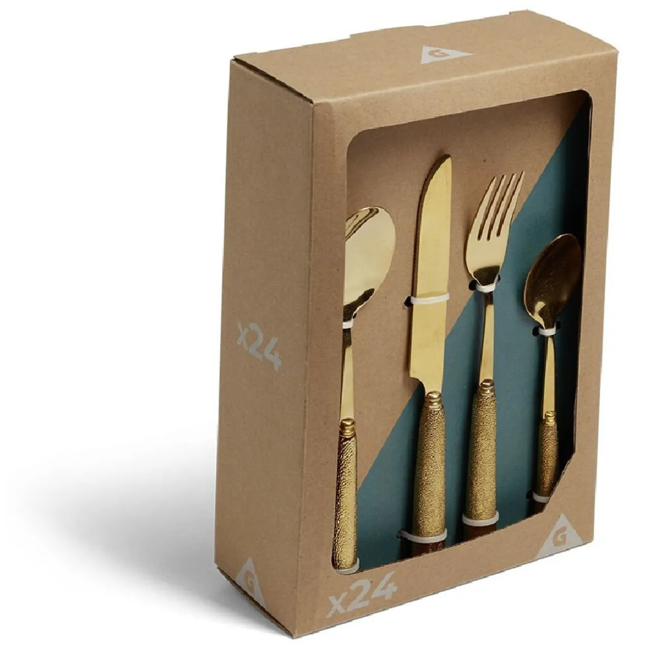 Cette ménagère composée de 16 couverts dorés avec manche effet pigment en relief comprend 4 fourchettes, 4 couteaux, 4 cuillères à soupe et 4 cuillères à café.
