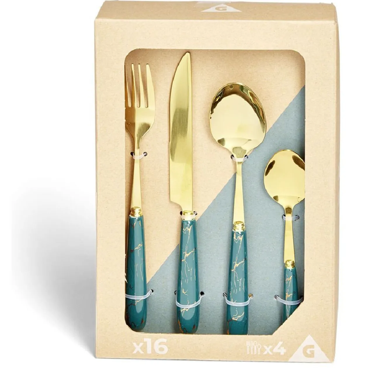 Apportez une touche chic à votre dressage de table avec cette ménagère composée 16 couverts dorés avec manche effet marbre noir ou vert (4 fourchettes, 4 couteaux, 4 cuillères à soupe, 4 cuillères à café).