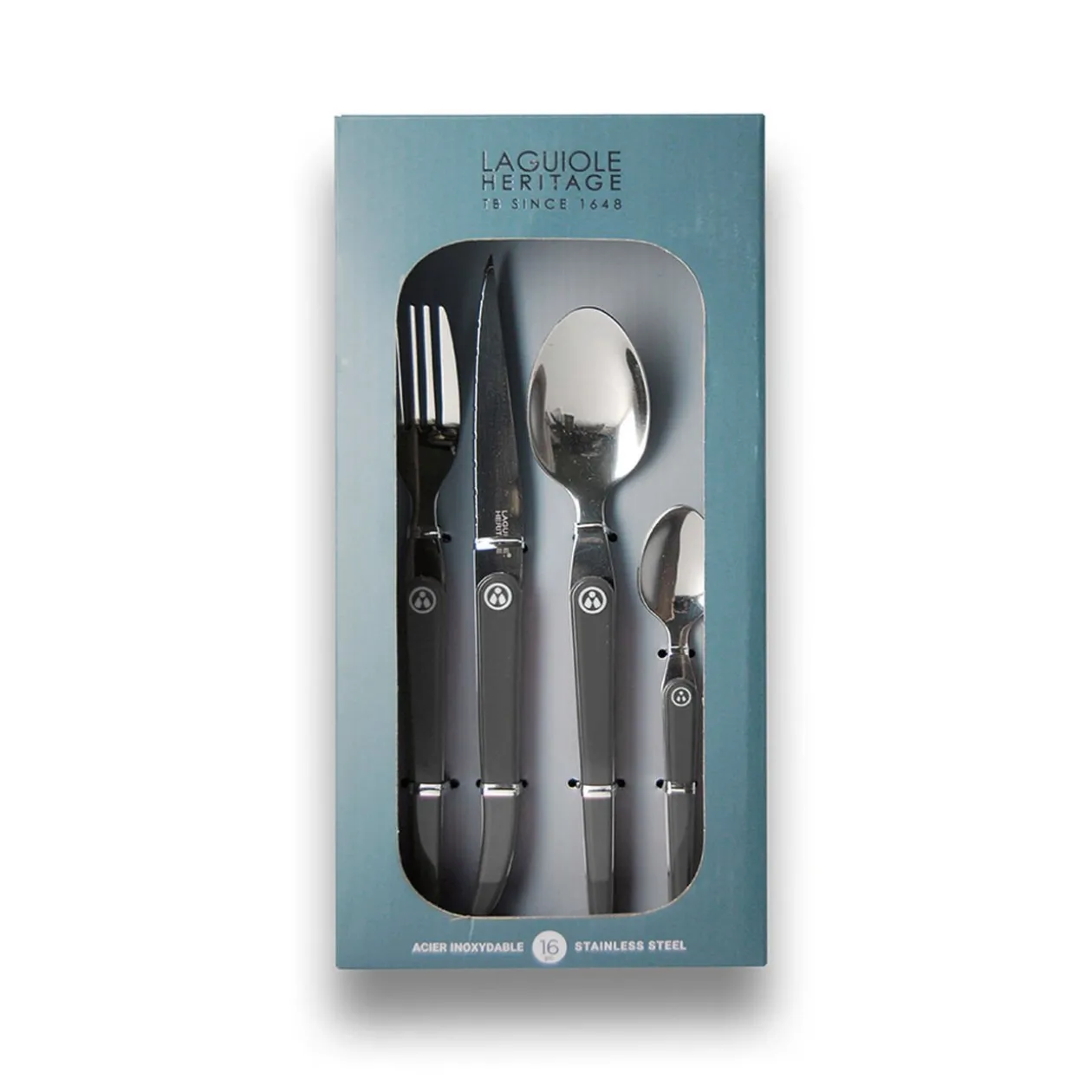 Découvrez l’élégance de la ménagère LAGUIOLE avec ses 16 pièces. Elle se compose de 4 couteaux – 4 fourchettes – 4 cuillères de table – 4 cuillères à café en boîte Laguiole Heritage.