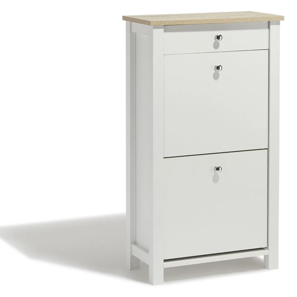 Si vous êtes fan des décorations qui sentent bon le grand air, alors vous allez craquer pour le meuble à chaussures Bristol ! Sa structure en panneau de particules revêtue en papier décor est à la fois responsable de son style vacances et détente et de sa stabilité remarquable. Le meuble à chaussures Bristol est capable de contenir jusqu’à 6 paires de chaussures dans son assortiment de trois tiroirs et de deux portes. Son design relaxant et épuré convient parfaitement à des compositions style grand air qui vous font respirer avec des lignes simples et des couleurs lumineuses et vivifiantes. Pour le même style, allez voir la console de la gamme Bristol !