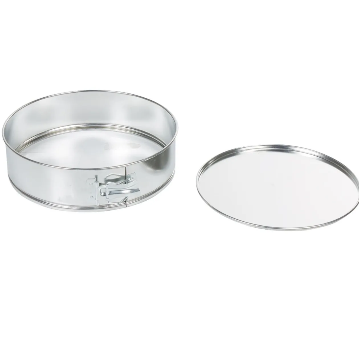 Moule à gâteau rond gris, avec système de ouverture/fermeture à charnière pour un démoulage facile.