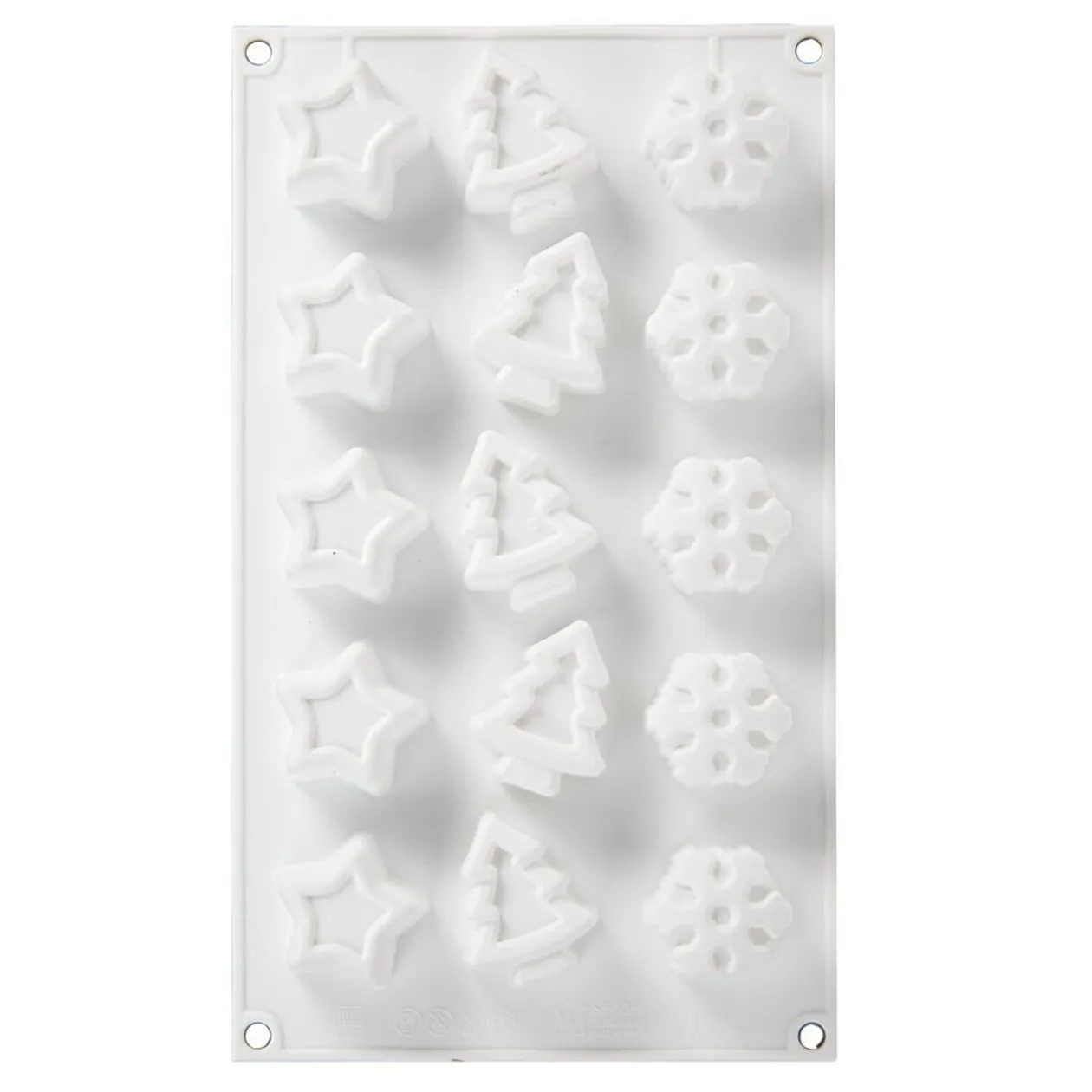 Moule en silicone avec 15 empreintes de formes différentes: sapins, étoiles, flocons.
