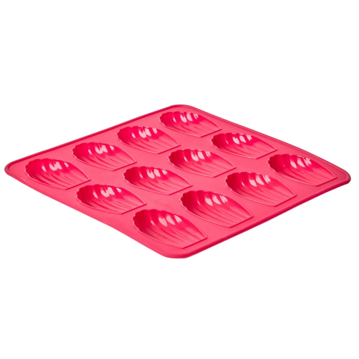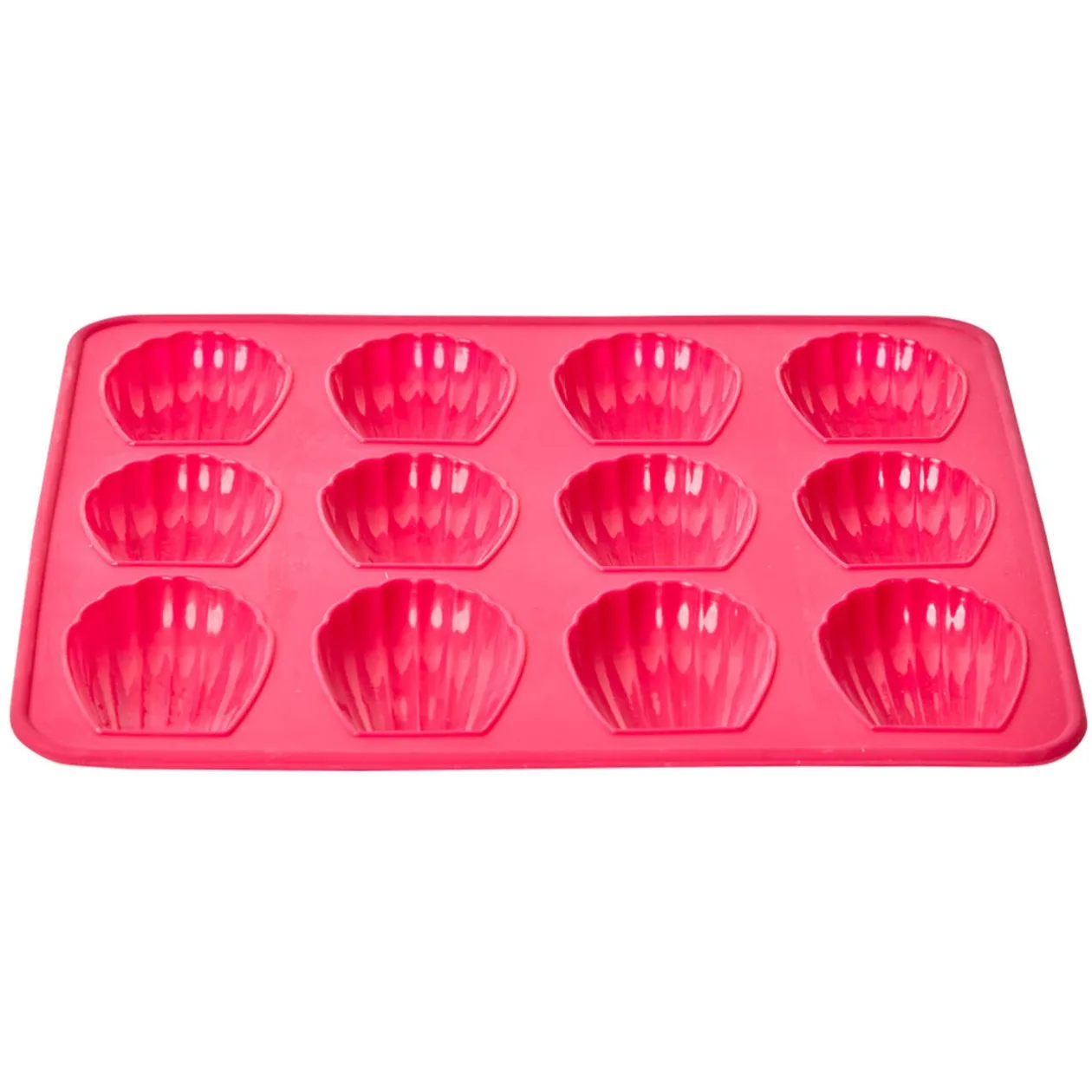 Moule en silicone rose pour réaliser 12 madeleines.