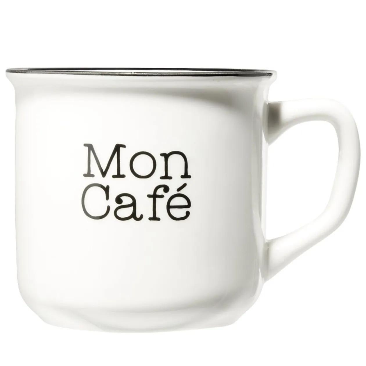 Découvrez le mug café en porcelaine effet émail blanc avec bord noir, parfait pour savourer votre café du matin.