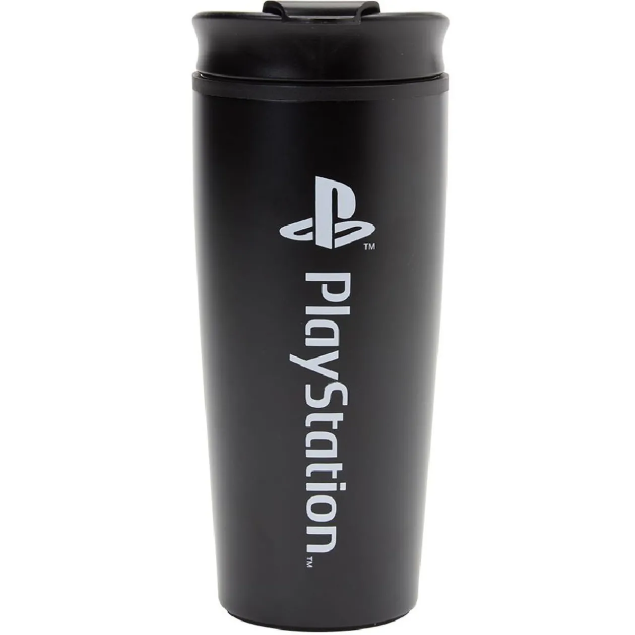 Mug de voyage en acier motif Playstation Onyx, idéal pour transporter vos liquides chauds en toute sécurité et pour longtemps.