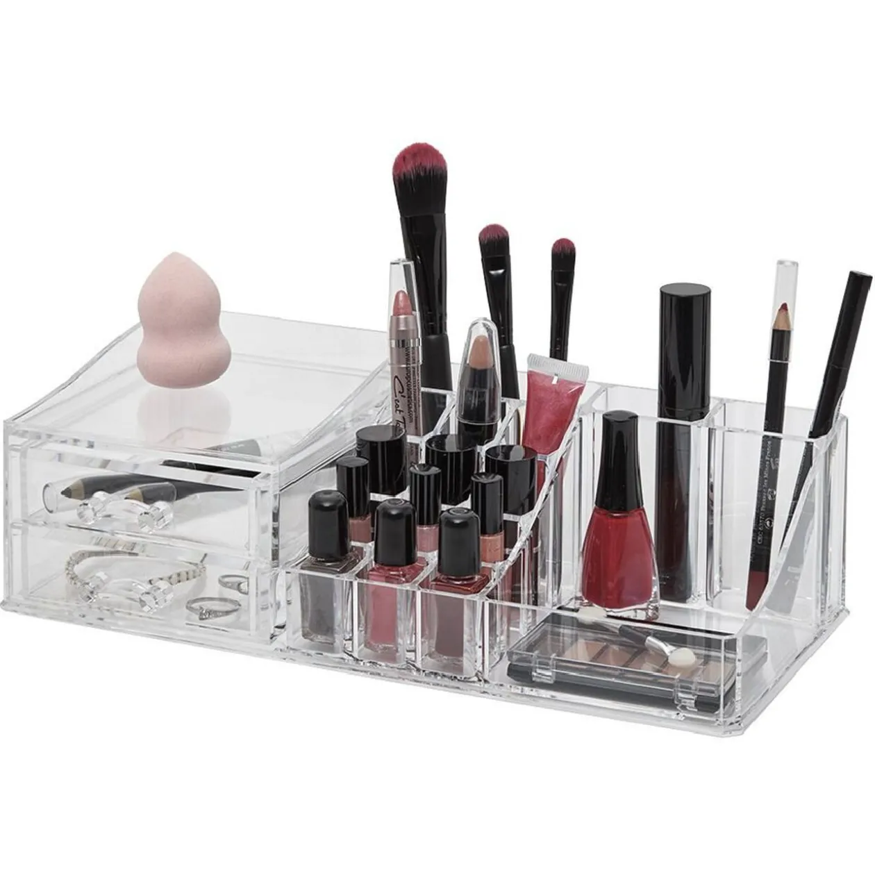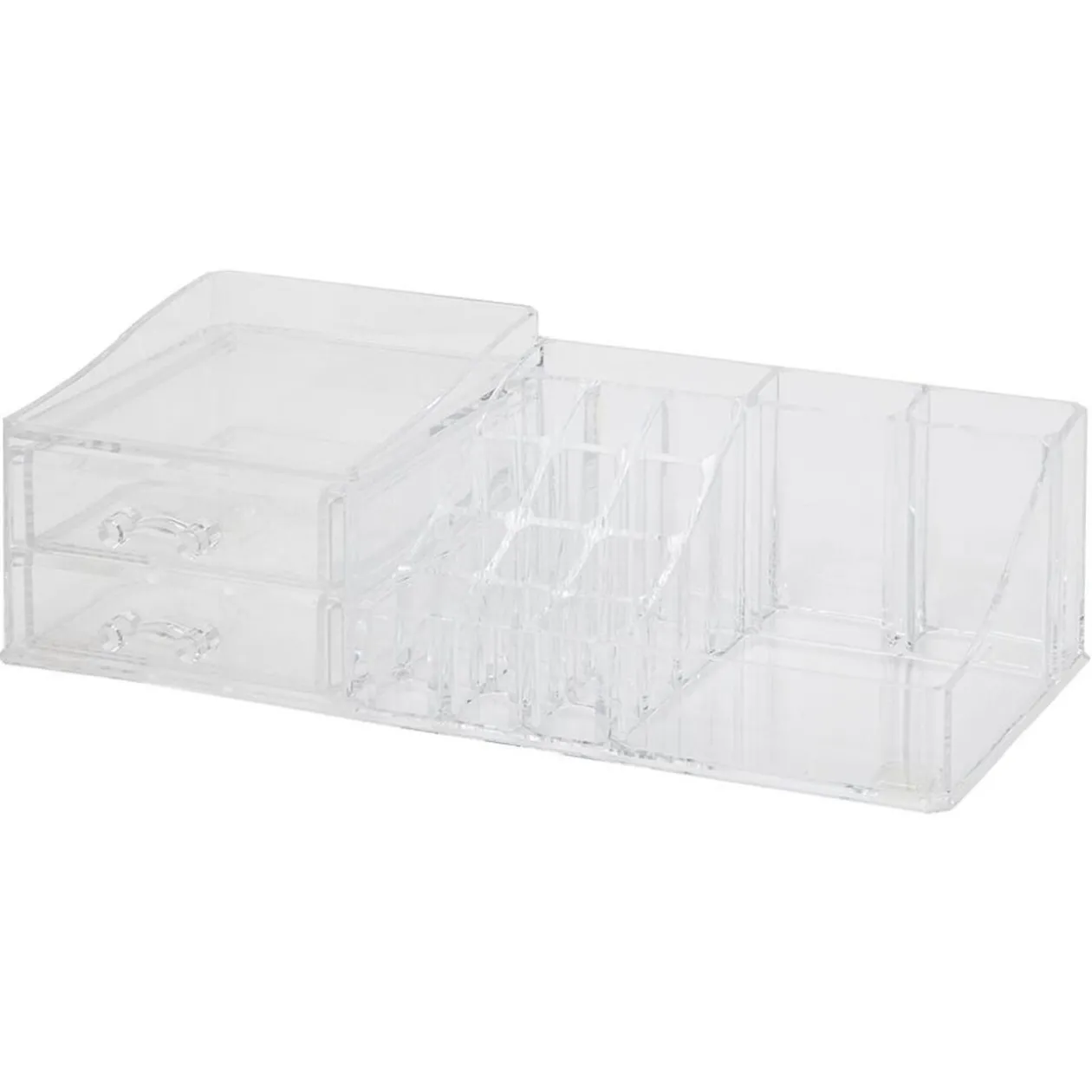 Rangement doté de 2 tiroirs et multiples compartiments pour organiser vos cosmétiques et pinceaux et autres accessoires de maquillage.