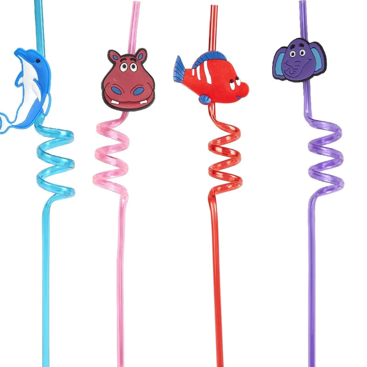 Idéal pour un évènement festif ! Lot de 4 pailles fantaisie bleue, rose, violette et rouge, décor tête d’animaux avec tortillon sur le milieu de la paille.