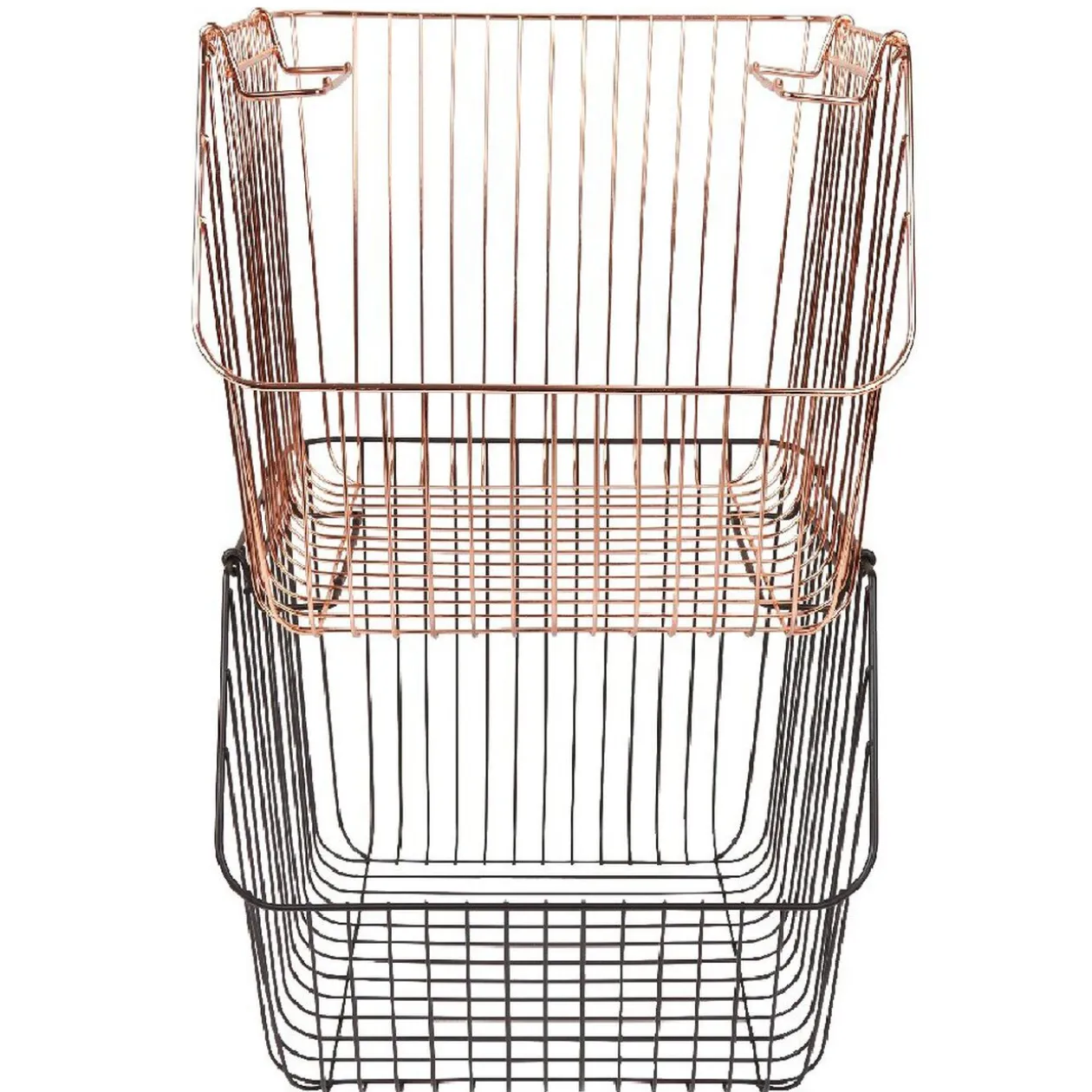 Optez pour ce panier au design filaire en métal noir, avec anses et superposable pour un accès direct au contenu.
