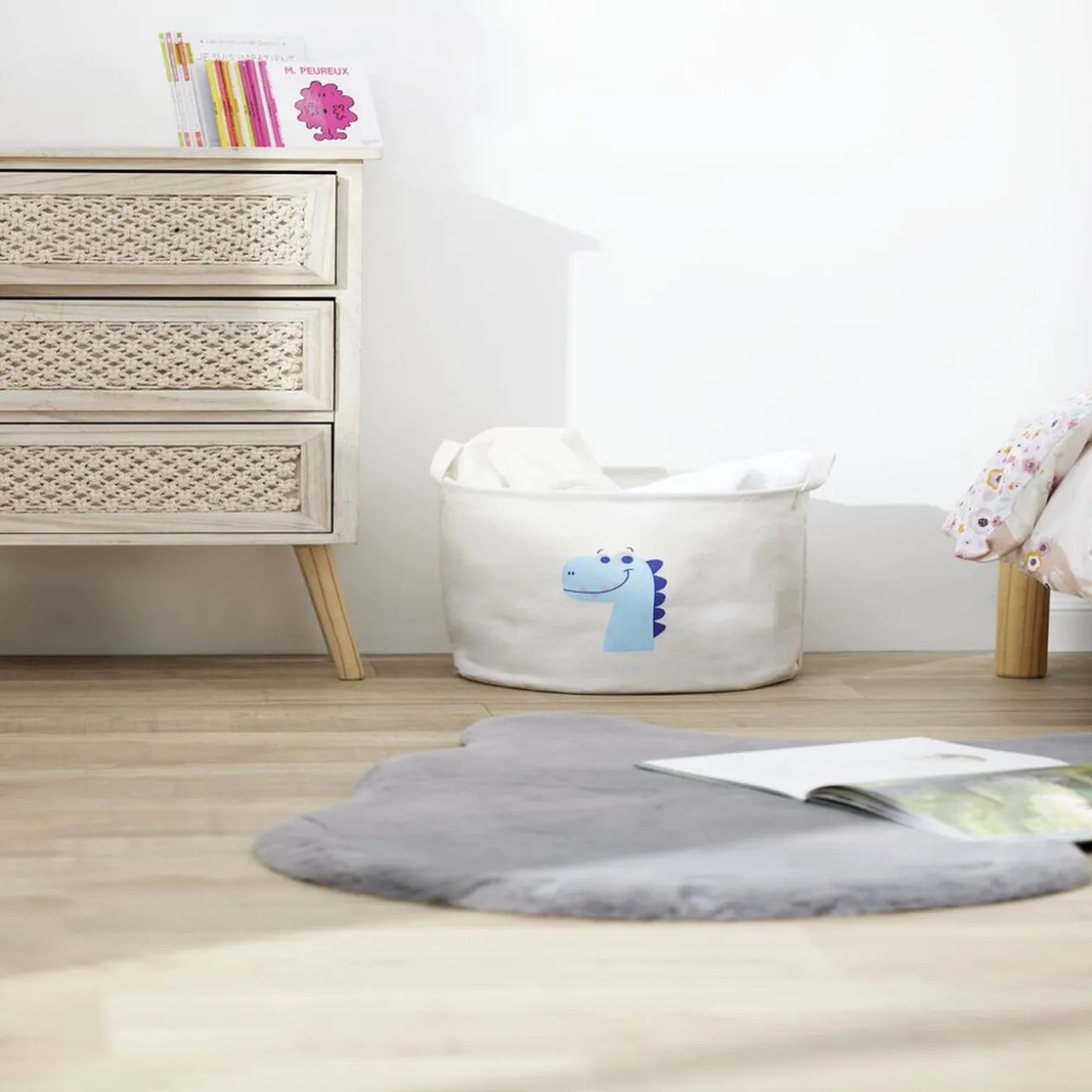 Apportez une touche de magie et d’organisation à la chambre de votre enfant avec cette panière de rangement en toile.