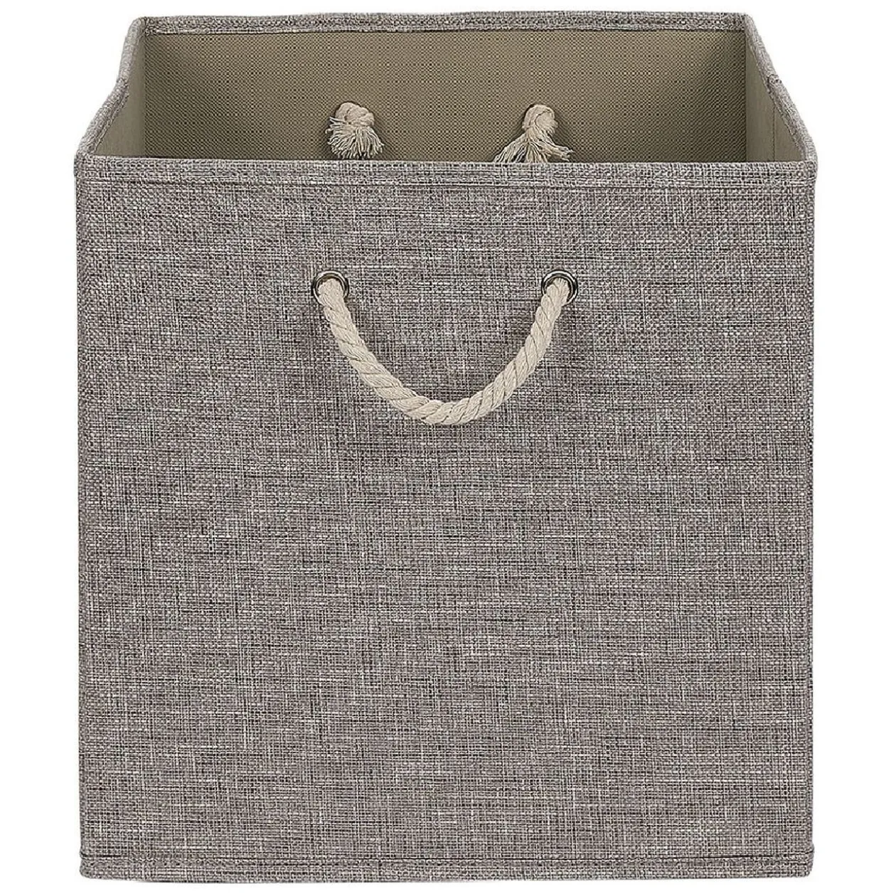 Panière de rangement Box Cube avec revêtement non tissé gris et anses décoratives en corde naturelle.