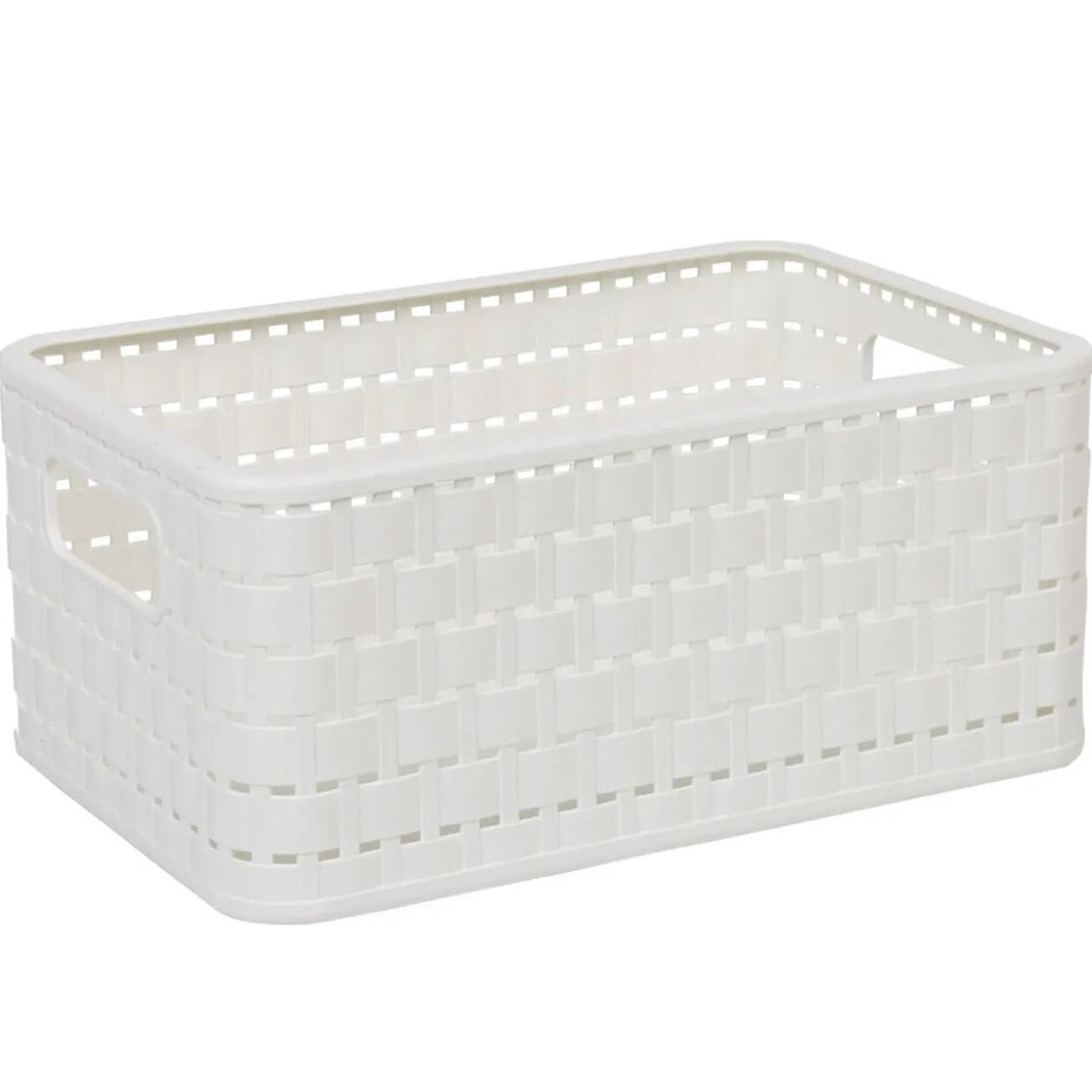 Panière blanche en plastique effet tressé d’une contenance de 6 litres.