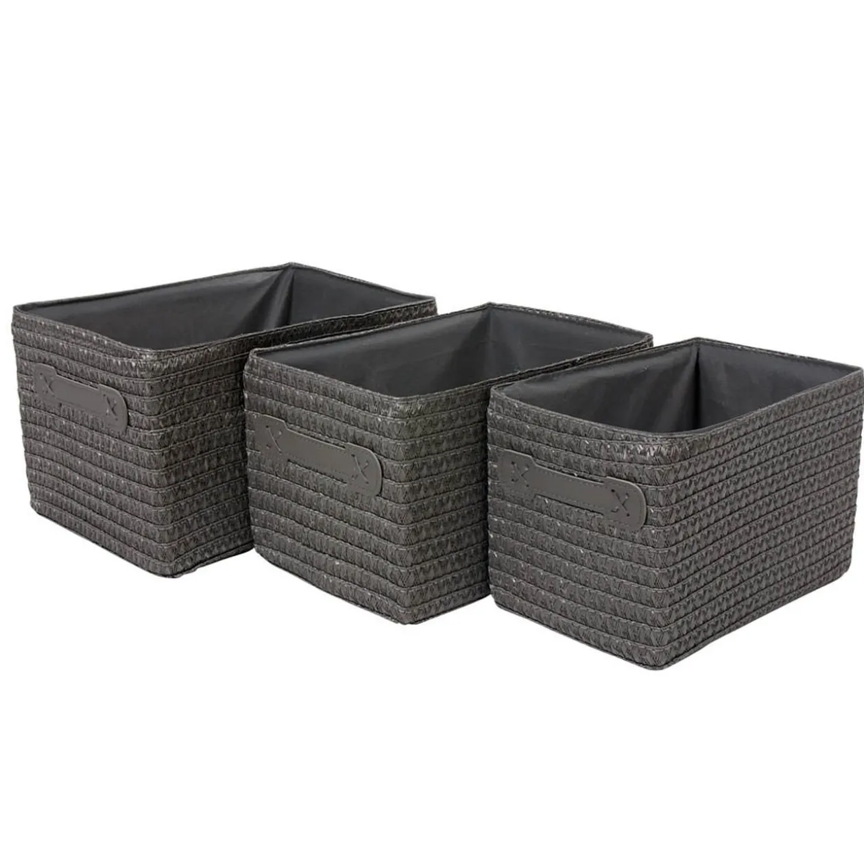 Set de 3 panières grises en plastique effet tressé et décorées de poignées.