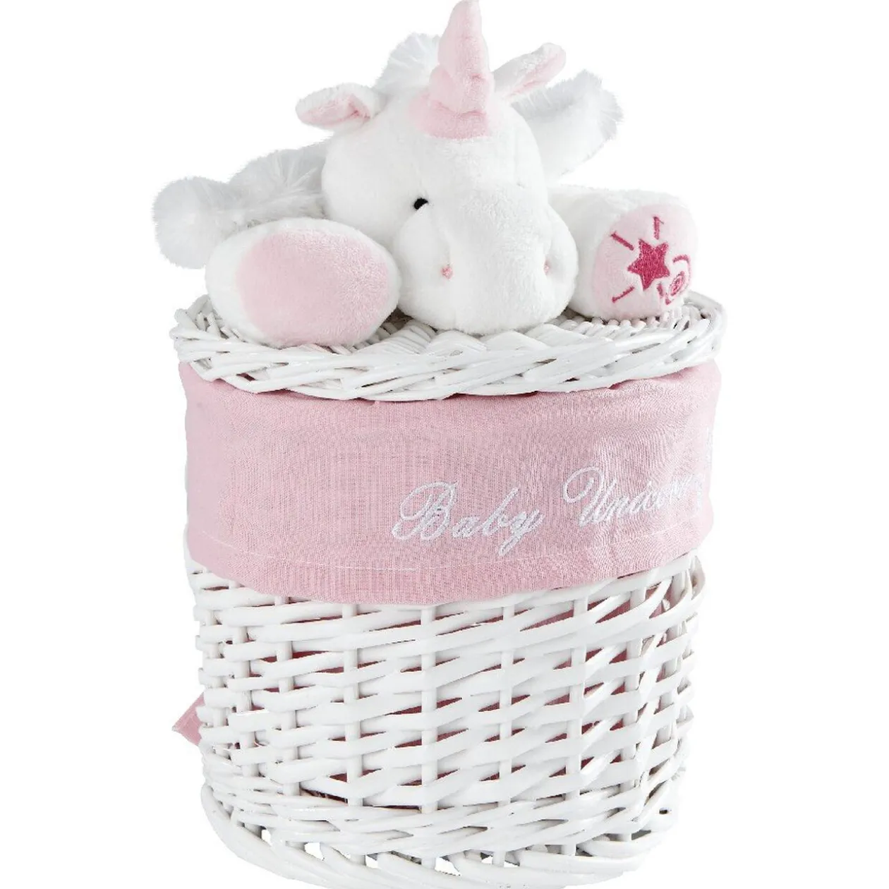 Décorez la chambre de votre fille de cette jolie panière ronde rose et blanche avec couvercle orné d’une licorne en peluche.