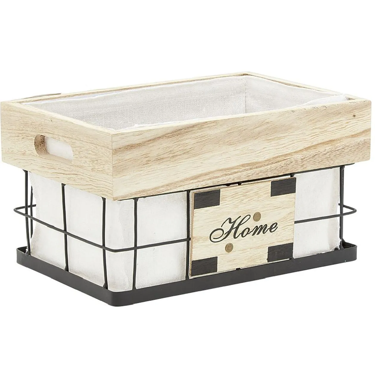 Panière déco carrée avec inscription « Home » de couleur naturel avec quadrillage noir et tissu blanc.