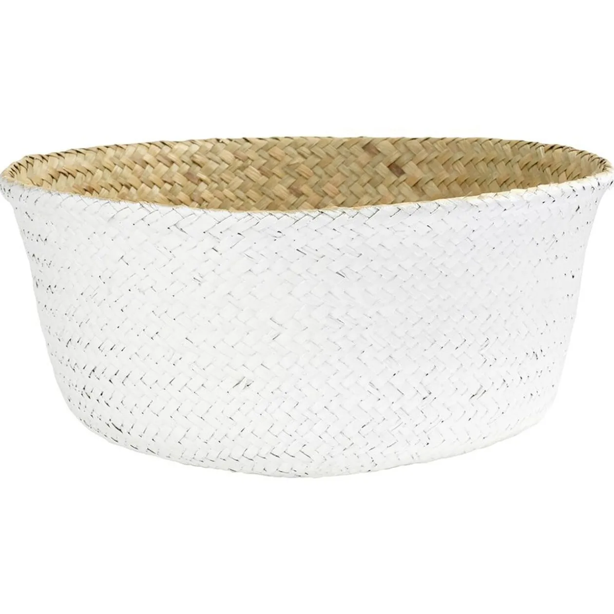 Optez pour cette panière en forme de boule en jute bicolore blanc et naturel et finition décor dentelle.