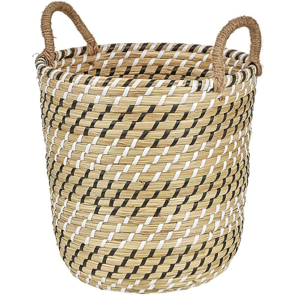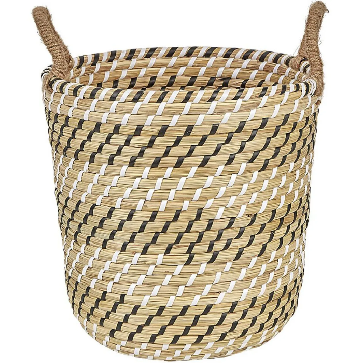 Jolie panière en jonc de mer tressé de coloris naturel, blanc et noir pour apporter une touche ethnique et végétale à votre intérieur. Dotée de anses, elle pourra servir de panière à linge ou de rangement pour les jouets, chargeurs de téléphones et autres accessoires.