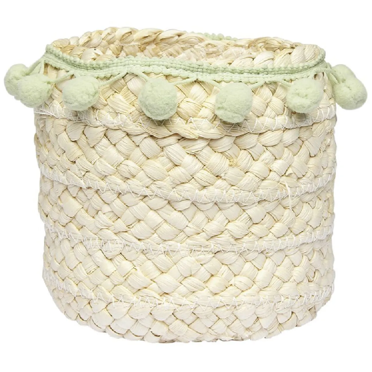 Ajoutez une touche bohême à votre rangement avec cette jolie panière en jonc naturel décorée de pompons verts. Pratique pour organiser avec style vos affaires du quotidien.