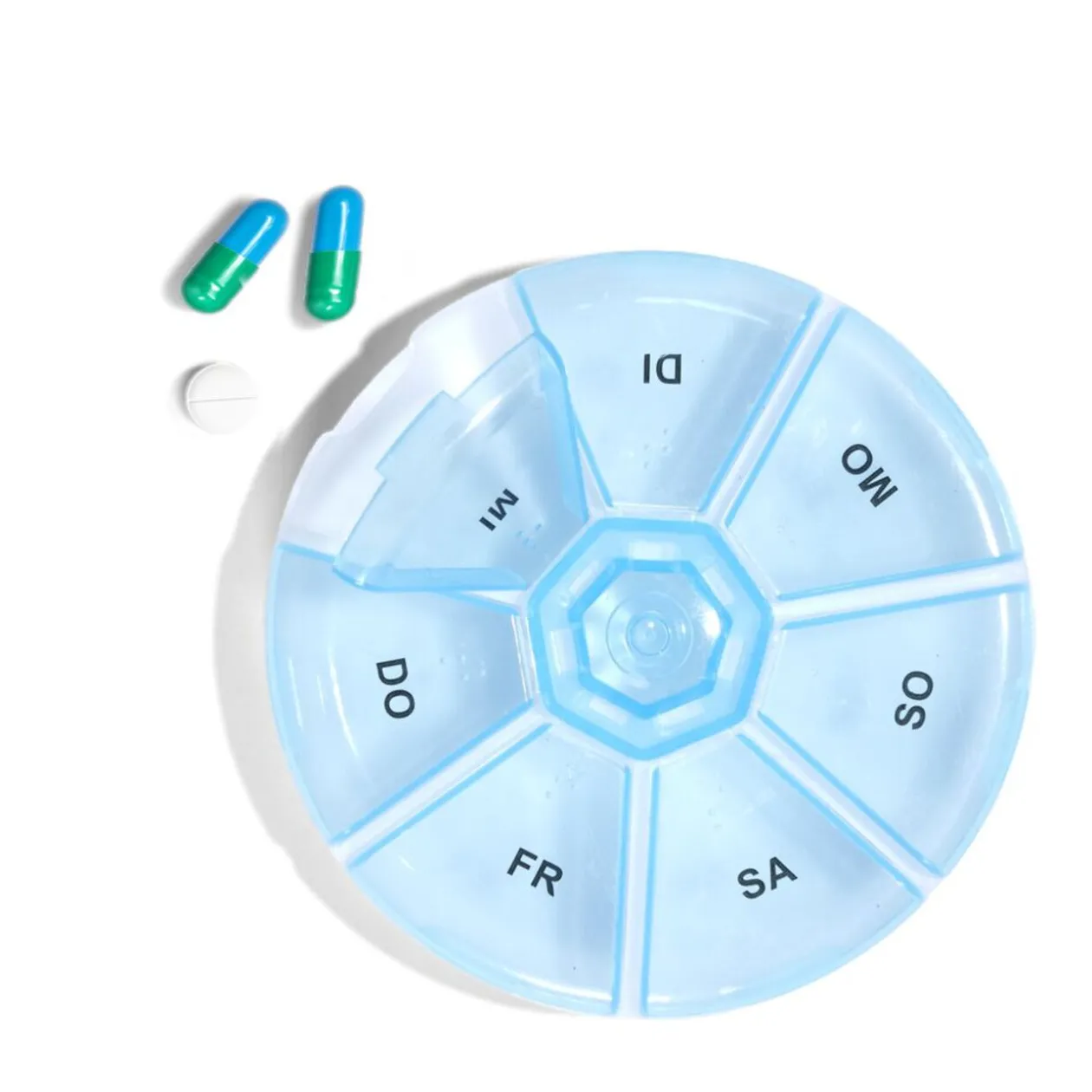 Organisez vos médicaments et compléments alimentaires avec ce pilulier rond à 7 compartiments.