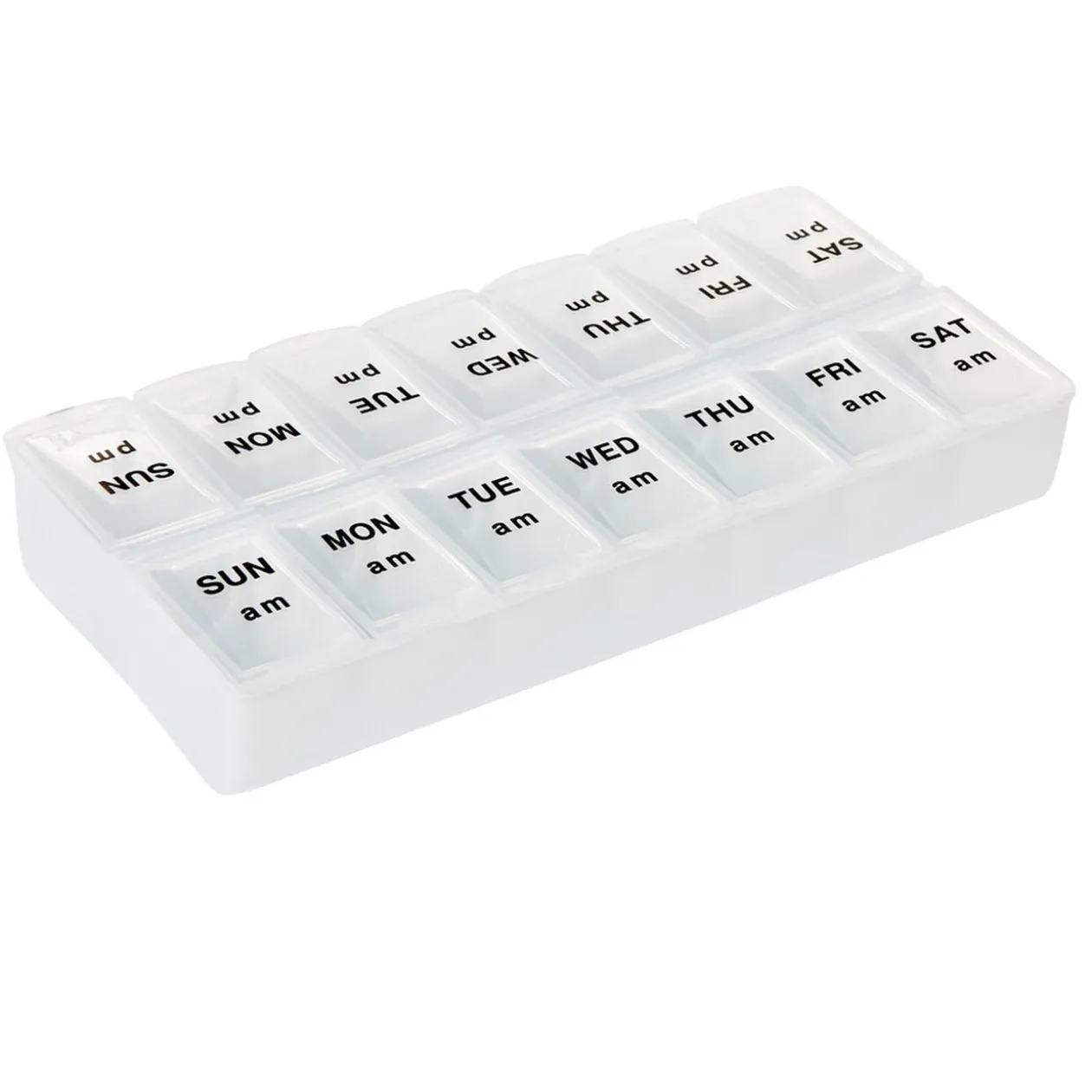Idéal pour ne plus oublier vos médicaments ! Pilulier rectangulaire de 14 compartiments avec les jours de la semaine inscrits.