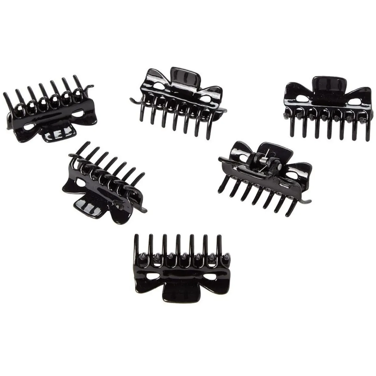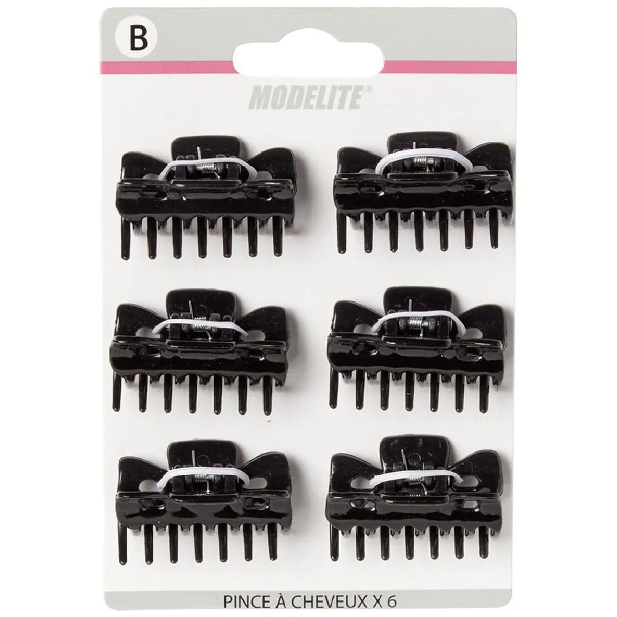 Lot de 6 petites pinces crocodiles en plastique uni noir brillant. Longueur : 4 cm
