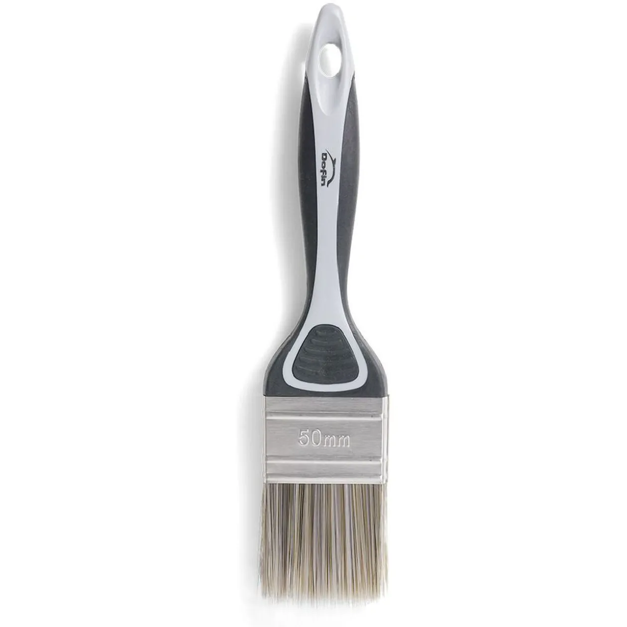 Pinceau plat en poils synthétiques de 50 mm de large avec manche bi-matière.