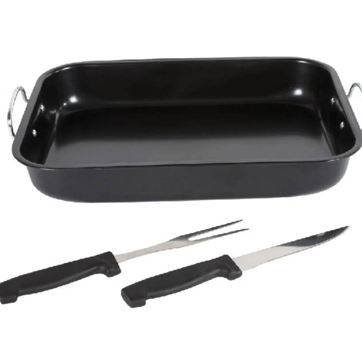 Plat à four dim. 39x29x6 cm, métal, revêtement antiadhérent, 1 couteau l. 26 cm, lame inox, 1 fourchette l. 26 cm.