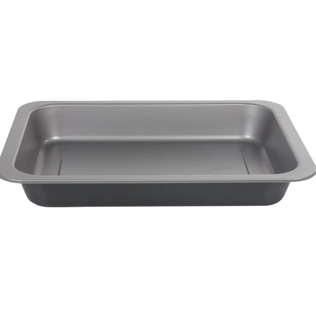 Grand plat à four rectangulaire en acier gris avec revêtement antiadhérent, idéal pour un démoulage facile.