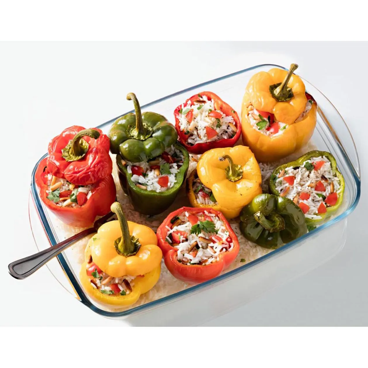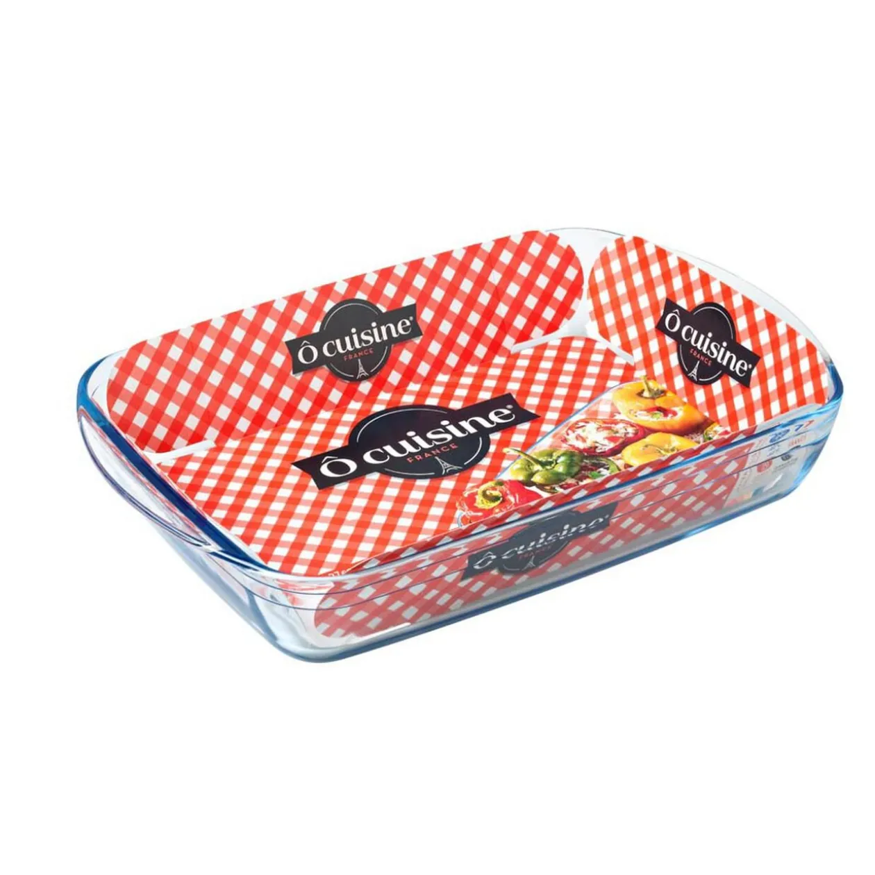 Plat à four rectangulaire en verre transparent de 39×23 cm de dimensions.