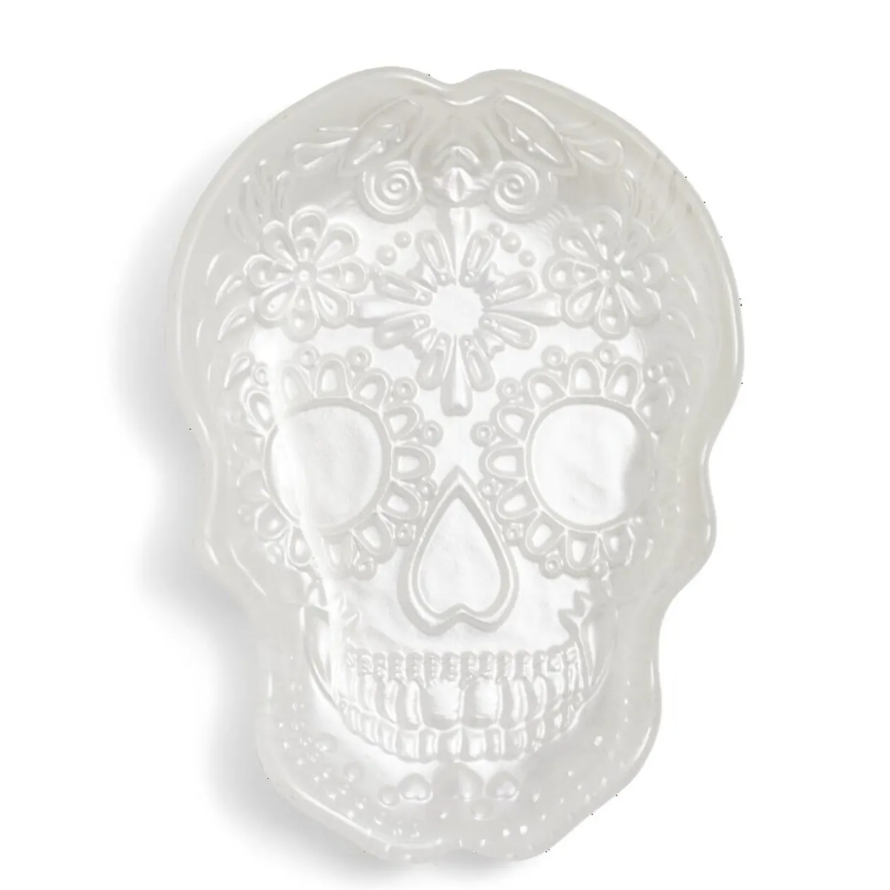 Apportez une touche de fantaisie à votre soirée d’Halloween avec ce plat blanc en forme de tête de mort mexicaine.